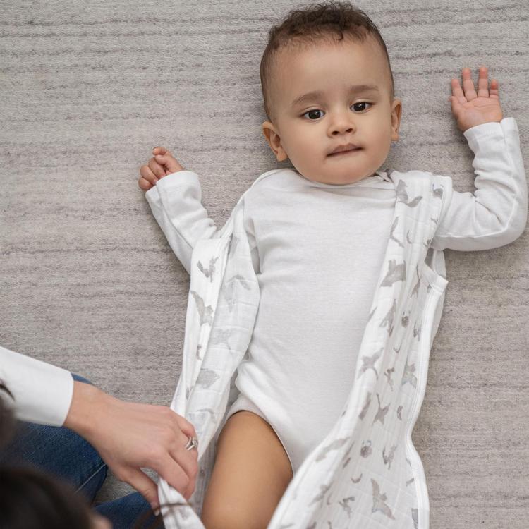 Impossible for little legs to kick off, the aden + anais GOTS certified organic cotton muslin sleeping bag keeps them feeling comfy + secure when transitioning out of a swaddle. Designed to be worn over pajamas, sleep sacks eliminate the need for unsafe loose blankets in the crib. They’re made from lightweight breathable muslin that allows for airflow to reduce the risk of overheating. Sized to be extra-long so your babe has more room to wiggle and sleep comfortably. The convenient inverted bottom zipper makes nighttime or naptime diaper changes a breeze. Aden + Anais sleep sacks are consciously crafted with quality and sustainability in mind, and manufactured according to the strictest ecological, social, and processing standards.