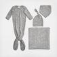 Aden + Anais' snuggle knit newborn gift set is the ultimate way to welcome baby into the world. Made from a supremely soft and super stretchy fabric, these essentials are sure to keep infants comfy no matter the season. The one-size-fits-all knotted baby hat grows with little ones, thanks to its snuggly stretch factor, and the knotted gown is designed with clever features that make life with baby easier. Its easy-access tie bottom allows for no-fuss diaper changes, a flexible neckline for easy changing lets you slide baby in and out of the gown without having to pull anything overhead, and protective fold-over cuffs prevent accidental scratches. The absorbent bandana bib is a stylish way to catch drools and dribbles while the swaddle blanket offers the ultimate in versatility, as it can also be used as a stroller cover, burp cloth, nursing cover, changing pad/mat cover and more.