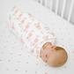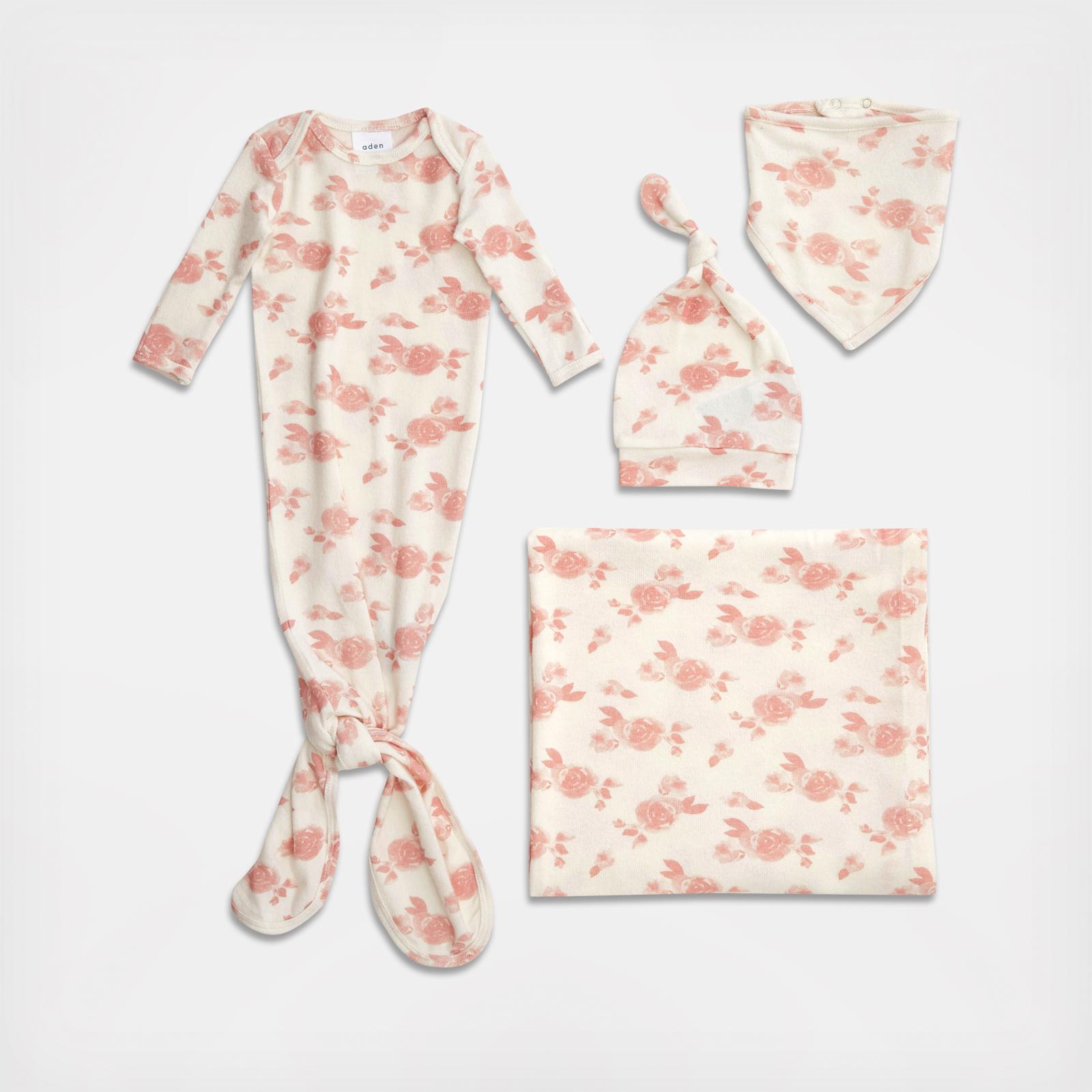 Aden + Anais' snuggle knit newborn gift set is the ultimate way to welcome baby into the world. Made from a supremely soft and super stretchy fabric, these essentials are sure to keep infants comfy no matter the season. The one-size-fits-all knotted baby hat grows with little ones, thanks to its snuggly stretch factor, and the knotted gown is designed with clever features that make life with baby easier. Its easy-access tie bottom allows for no-fuss diaper changes, a flexible neckline for easy changing lets you slide baby in and out of the gown without having to pull anything overhead, and protective fold-over cuffs prevent accidental scratches. The absorbent bandana bib is a stylish way to catch drools and dribbles while the swaddle blanket offers the ultimate in versatility, as it can also be used as a stroller cover, burp cloth, nursing cover, changing pad/mat cover and more.
