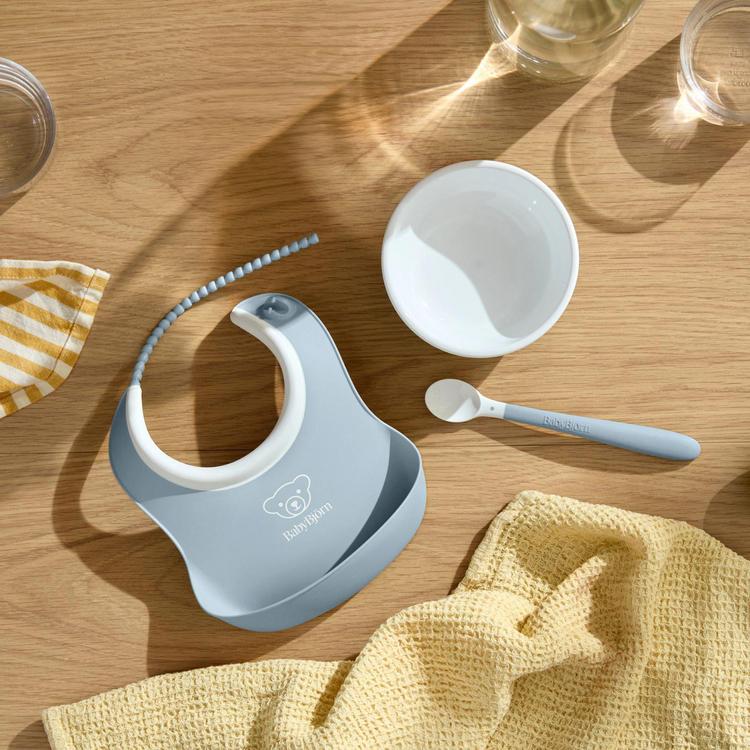 This set is perfect for young children just beginning to taste solid foods but are still being fed by a parent. It includes all the essentials for introducing your baby to solids: a sturdy bowl that is easy to hold in one hand (so you can feed with the other), a feeding spoon with a long handle, and a comfy bib to catch any mess. The baby bowl and the feeding spoon can be used from approximately six months of age. The baby bib is from about four months of age.