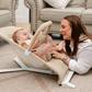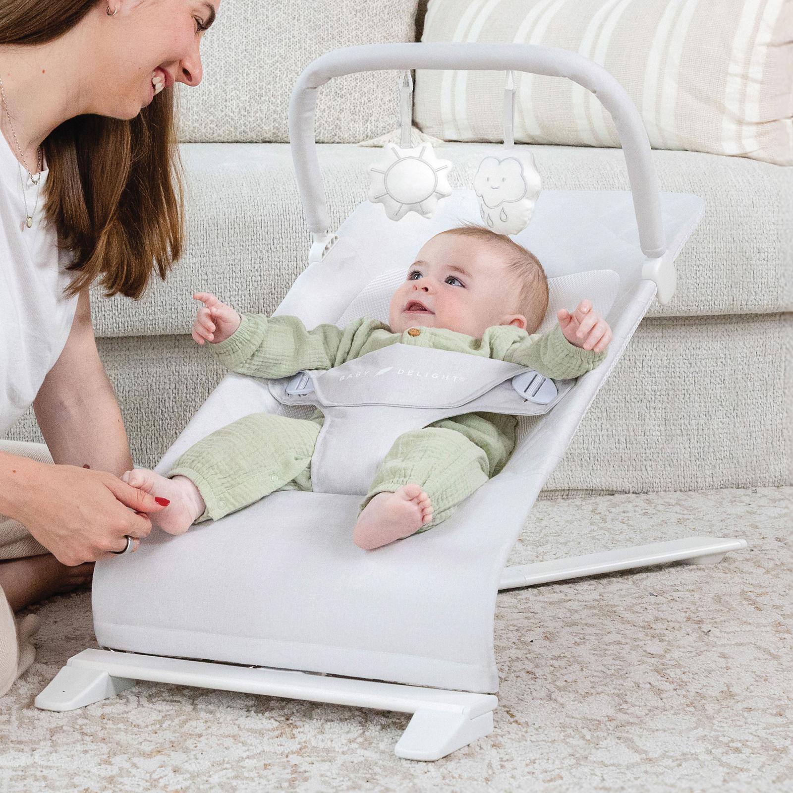 Sit, play, relax, and do it all in style and now, in ultra-soft comfort. The Alpine Deluxe Portable Bouncer features our new Sherpa (or Boucle) fabric option, offering a plush, cozy seat that feels as gentle as a hug. The seat cover, designed with a breathable mesh inset for airflow, can be easily removed for machine washing. While baby bounces naturally, the strong yet lightweight frame provides three recline positions for customized comfort. A 3-point adjustable harness keeps baby secure during meals or playtime, and the removable toy bar includes adorable deluxe plush toys for added entertainment. Plus, an included carry bag makes travel and storage effortless.