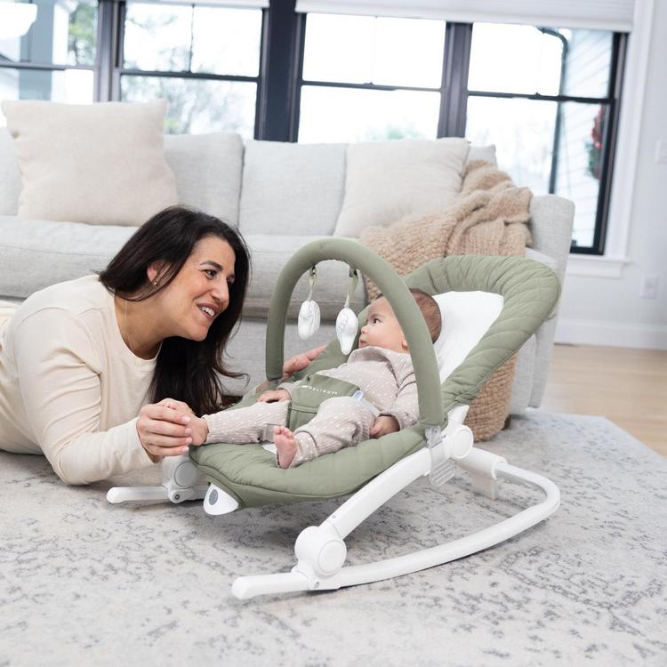 Your little one can comfortably lounge, rock, bounce, and play in the Baby Delight Aura Deluxe Rocker/Bouncer. Whether they are looking to gently bounce or rock, they will be happily entertained while playing with the two included plush toys! The 2-position recline option, combined with the sound and vibration unit, will surely soothe your baby while giving your arms a bit of a rest. The 3-point harness and breathable mesh inset provide your little one with a safe space while providing you with some peace of mind. And because style matters, the Aura was created with a premium, plush, Charcoal Tweed fabric that was designed to go in any home’s aesthetic. It can also be removed quickly and easily for machine washing. When you are ready to travel (or store the Aura), it folds up quickly with the push of two buttons.