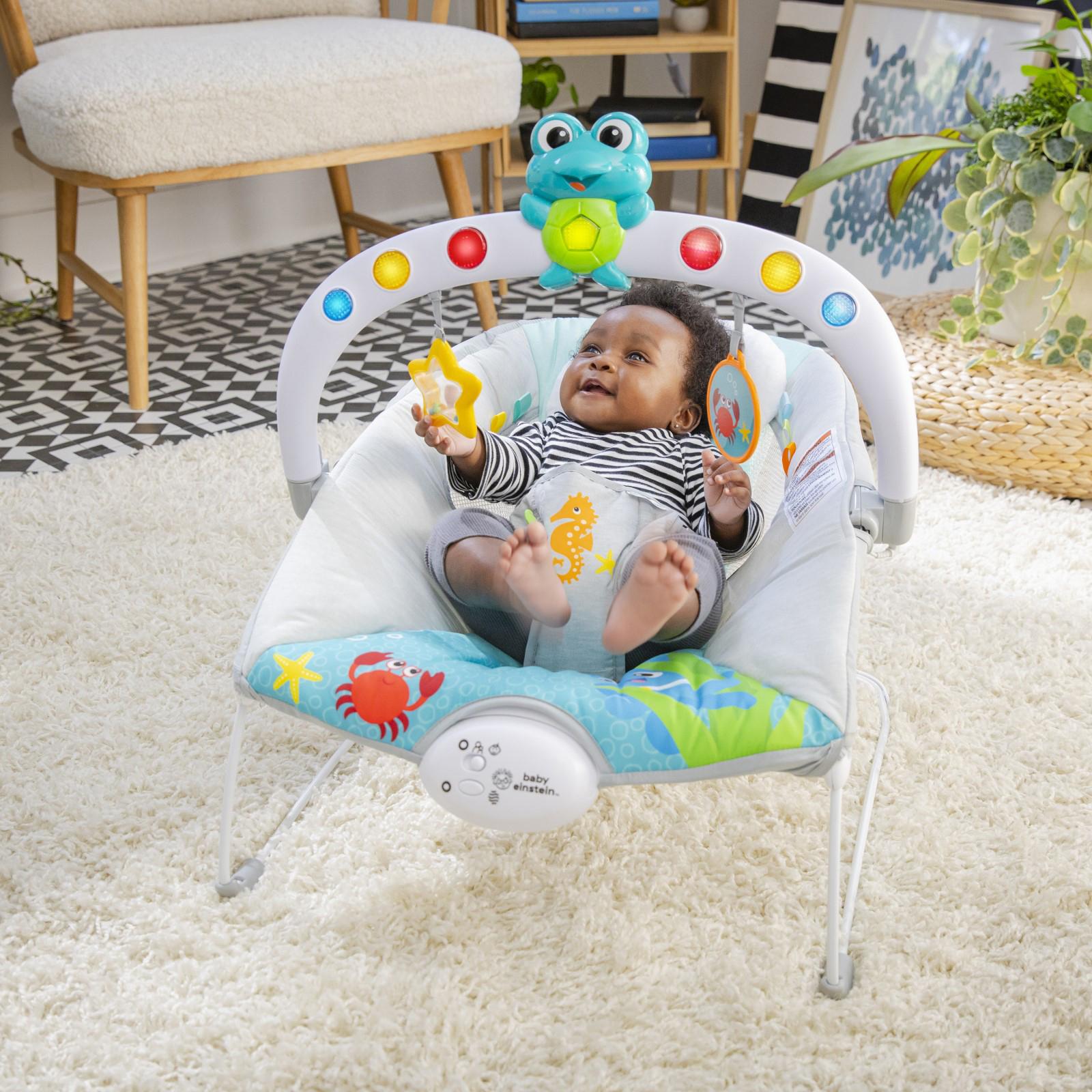 The Baby Einstein Ocean Explorers Kick to It Neptune Musical Bouncer rewards baby’s movements and exploration with lights, music, and ocean sounds. In Baby-Activated Mode, baby’s kicks trigger lights and music to engage and support cause-and-effect learning. Parent-activated mode plays 15 continuous classical and Baby Einstein Ocean Explorers melodies. Crab toy with baby safe mirror, starfish rattle, and 6 taggies encourage motor skill development while promoting self-discovery. Removable headrest included for extra support. 3-point harness keeps baby secure. Removeable seat pad cleans easily. For use by children up to 20 pounds.