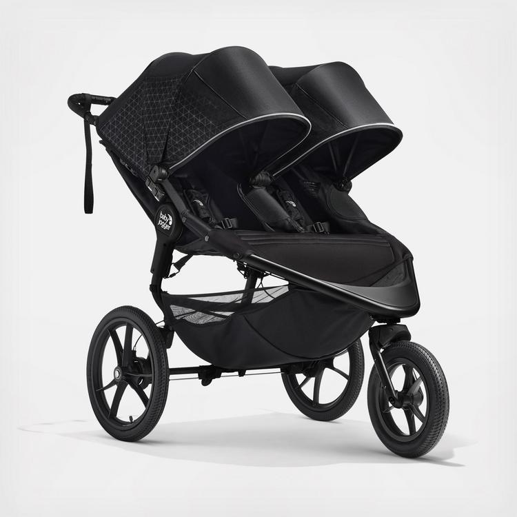 The Summit X3 Double Jogging Stroller outmaneuvers other jogging strollers on any terrain. And like you, this stroller/jogger hybrid is made to tackle more. Air-filled rubber tires, all-wheel suspension, and a unique, hand-operated deceleration brake provide increased control and added safety as you hit the pavement, making you unstoppable. Its striking all-black design raises the bar on style and features reflective accents for better visability in the streets. This jogging stroller's front swivel wheel easily locks for jogging or running. The Summit X3 Double sports padded near-flat reclining seats and vented seat tops to increase airflow when reclined. Large, adjustable sun canopies with mesh windows and mesh side vents, plenty of storage, one-action compact fold, and a rear parking brake complete the Summit X3 Double Jogging Stroller. Customize your running stroller with the following available accessories (sold separately): Car seat adapters, and weather shield to protect from the elements. The Summit X3 Jogging Stroller is designed to keep up with you as you hustle with 2.