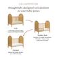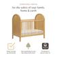 The Bondi 3-in-1 Convertible Crib celebrates boho-inspired design and natural materials with its warm wood tone, playfully arched side panels, and curved feet. The Bondi is designed to grow with your babe using an included toddler bed conversion rail and is screened for harmful chemical emissions to ensure it meets greenguard gold certification.