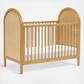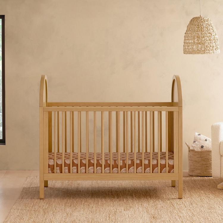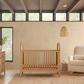 The Bondi Cane 3-in-1 Convertible Crib celebrates boho-inspired design and natural materials with its playfully arched side panels, curved feet, and woven plant-based cane. The Bondi is designed to grow with your babe using an included toddler bed conversion rail and is screened for harmful chemical emissions to ensure it meets greenguard gold certification.