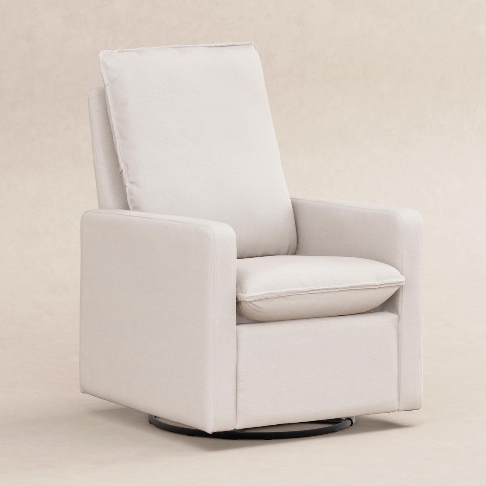 The Cali Pillowback Swivel Glider has been designed for mamas and papas with a high plush pillowback for head and neck support. The smooth gliding, 360-degree swivel base allows you to gently lull your babe to sleep. It's a stylish but also more sustainable choice for the modern nursery. Upholstered by hand in our eco-performance fabric, that is stain resistant, water repellent, and made with at least 30% recycled materials.