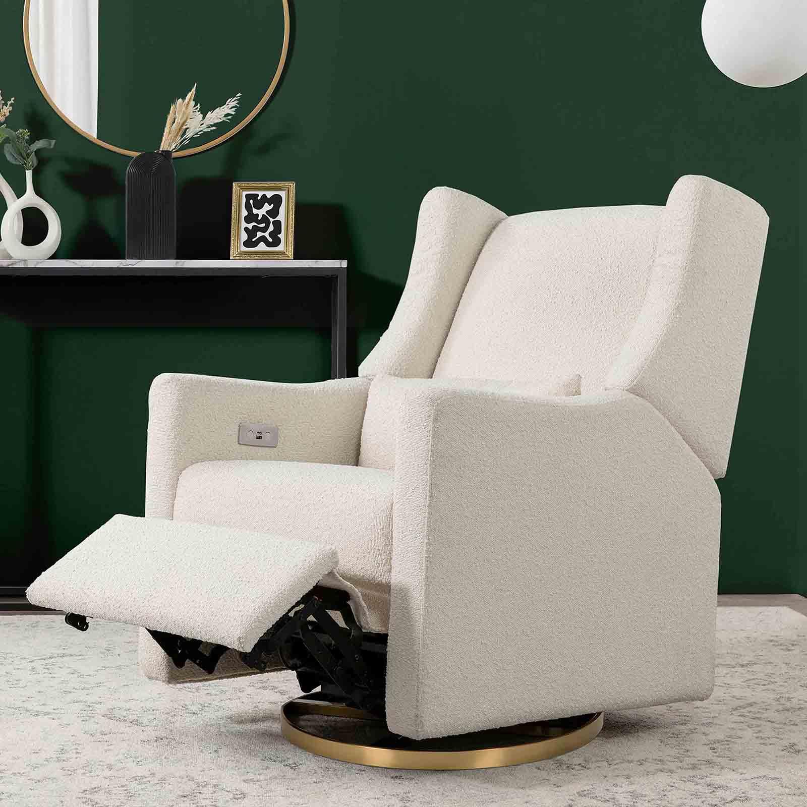 The Kiwi Glider Recliner takes the phrase “rest and recharge” to a whole new level with its built-in USB port, smooth swivel motion, and effortless back and forth gliding motion. Lean back and kick up your feet at the touch of a button with this recliner’s quiet electronic control button. It's a stylish choice with a modern wingback design but also a more sustainable choice for your home. Upholstered by hand in our eco-performance fabric, that is stain resistant, water repellent, and made with at least 30% recycled yarn.
