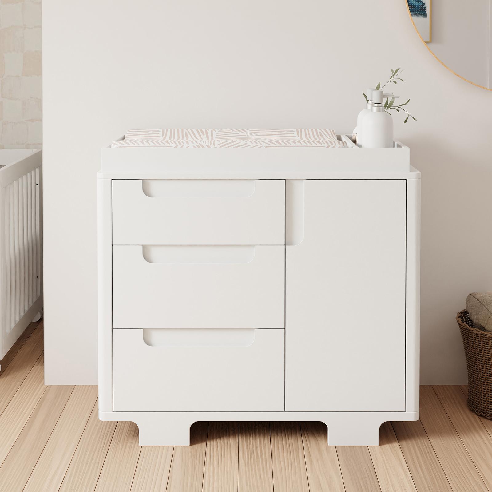 Designed to complement the Yuzu 8-in-1 All-Stages Crib, the Yuzu 3-Drawer Changer Dresser marries form and function with playful arched feet, gently curved corners, included changing tray, and plenty of storage with 3 drawers and 1 spacious cabinet. Whether you are going for a classic, modern, or eclectic look, this versatile dresser is a perfect statement piece in the nursery.