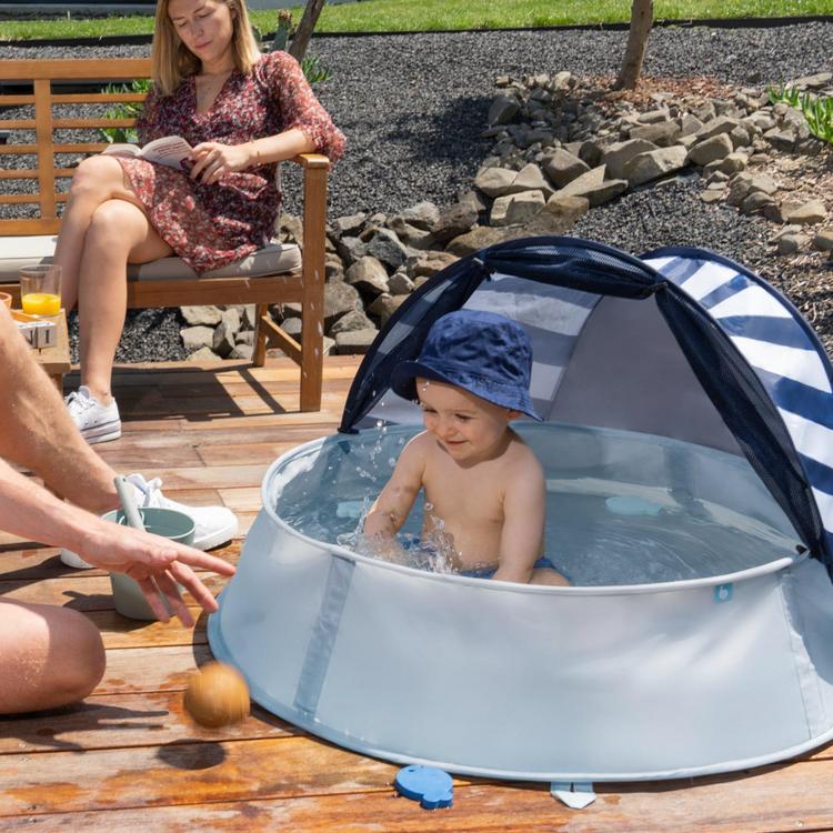 The dome material has an anti-UV rating of 50+ keeping your child's skin protected from 99% of harmful UV-A and UV-B rays. Its sturdy fabric and mosquito net also helps to block wind and sand when used as a beach tent, perfect for the outdoors. A soft and comfy removable floor mat ensures comfort during play and lounge time. Your little one will stay active with the three fun infant toys included. Thanks to its durable waterproof bottom fabric, simply remove the floor mat to convert the Aquani into a paddling pool that can hold up to 20 gallons of water.