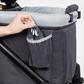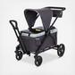 Super large cargo space with built-in seating for two, includes 3-point safety harness belt. Includes parent and child trays with 2 cup holders and center consoles, plus 2 additional cup holders outside of the wagon. Extra-large ratcheting canopy with UPF 50+ protection and air-flow mosquito netting. Hideaway pull handle easily allows the tour to transform from a push stroller to pull a wagon mode. Easy one-press removable and durable 11 rear and 8 front wheels with suspension. Large and easy push brakes. Compact flat fold for storage and travel.