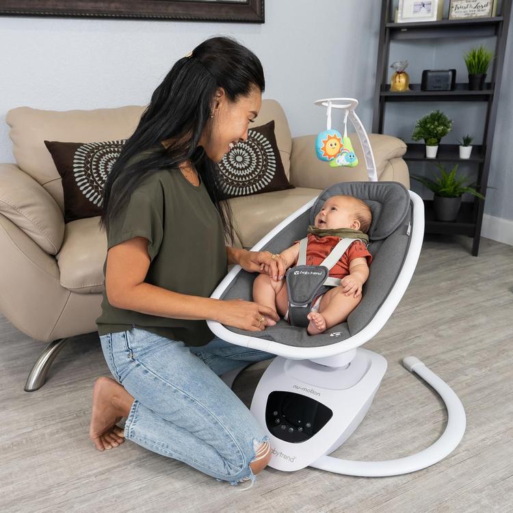5 real-life motion modes simulate parent holding, rocking, circling, and womb-like waves. Touchscreen menu manages all swing motions, speed, melodies, nature sounds, and volume. A remote for distant control of all swing settings.