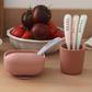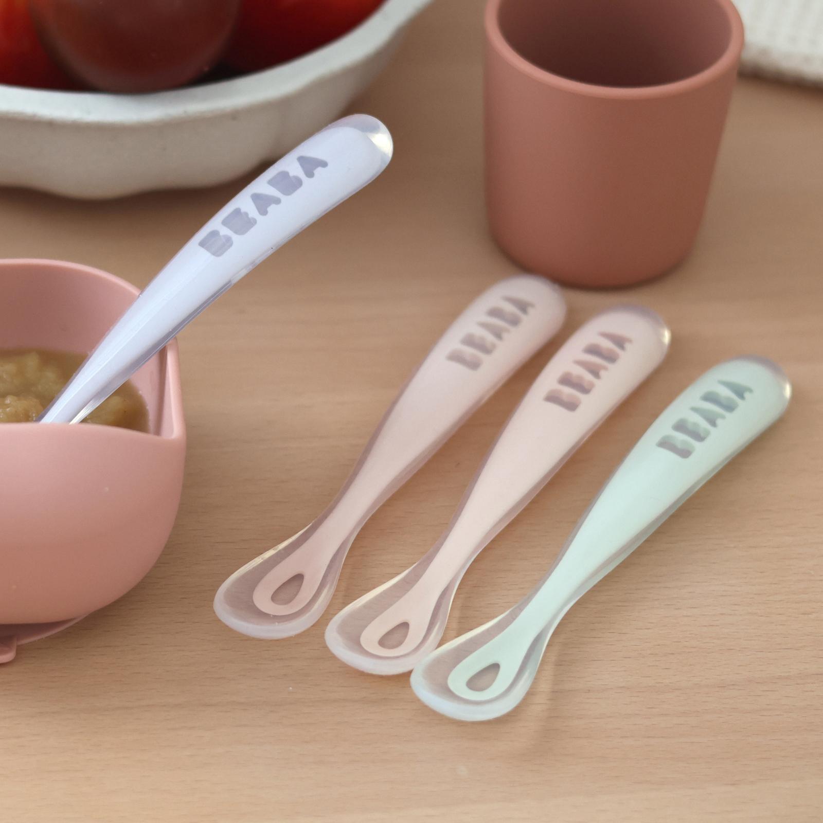 Set of 4 easy-grip 1st stage training spoons with long handles designed to fit all baby food containers and comfortably suit an adult’s hand.