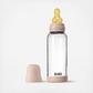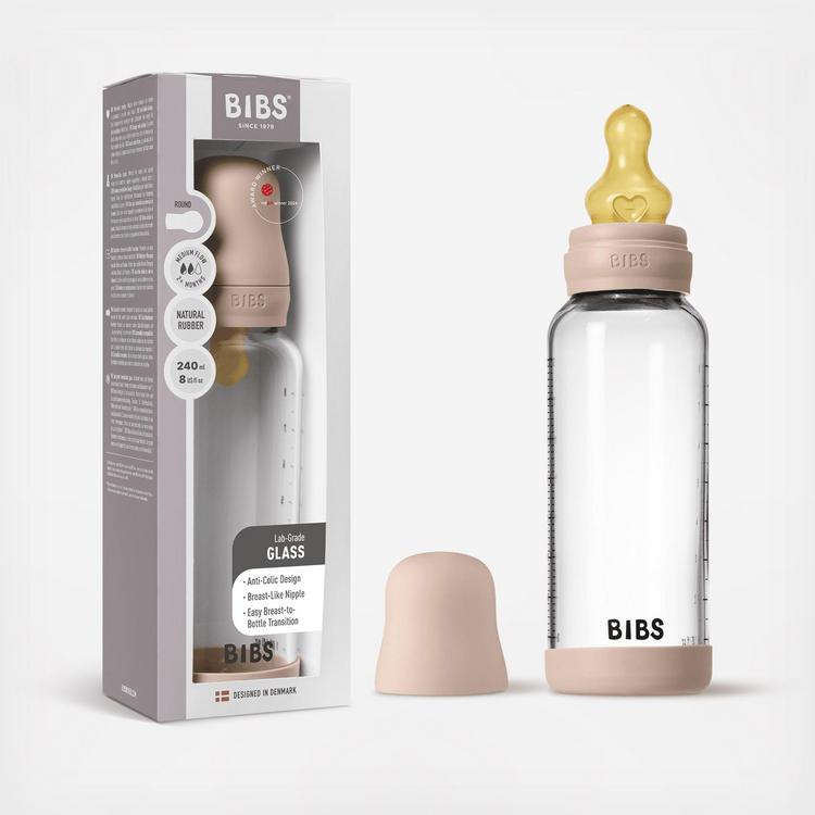BIBS Glass Baby Bottle offers a sleek, award-winning design with an anti-colic valve to reduce gas and reflux and a breast-like nipple that eases the transition between breastfeeding and bottle feeding. Featuring a dishwasher-safe, durable glass base that maintains a like-new appearance over time, and spill-minimizing components for convenient feeds at home or on the go. The natural rubber latex nipple is made of a highly flexible material from the Hevea tree, known for its skin-like softness. Comes with a slow-paced flow.
