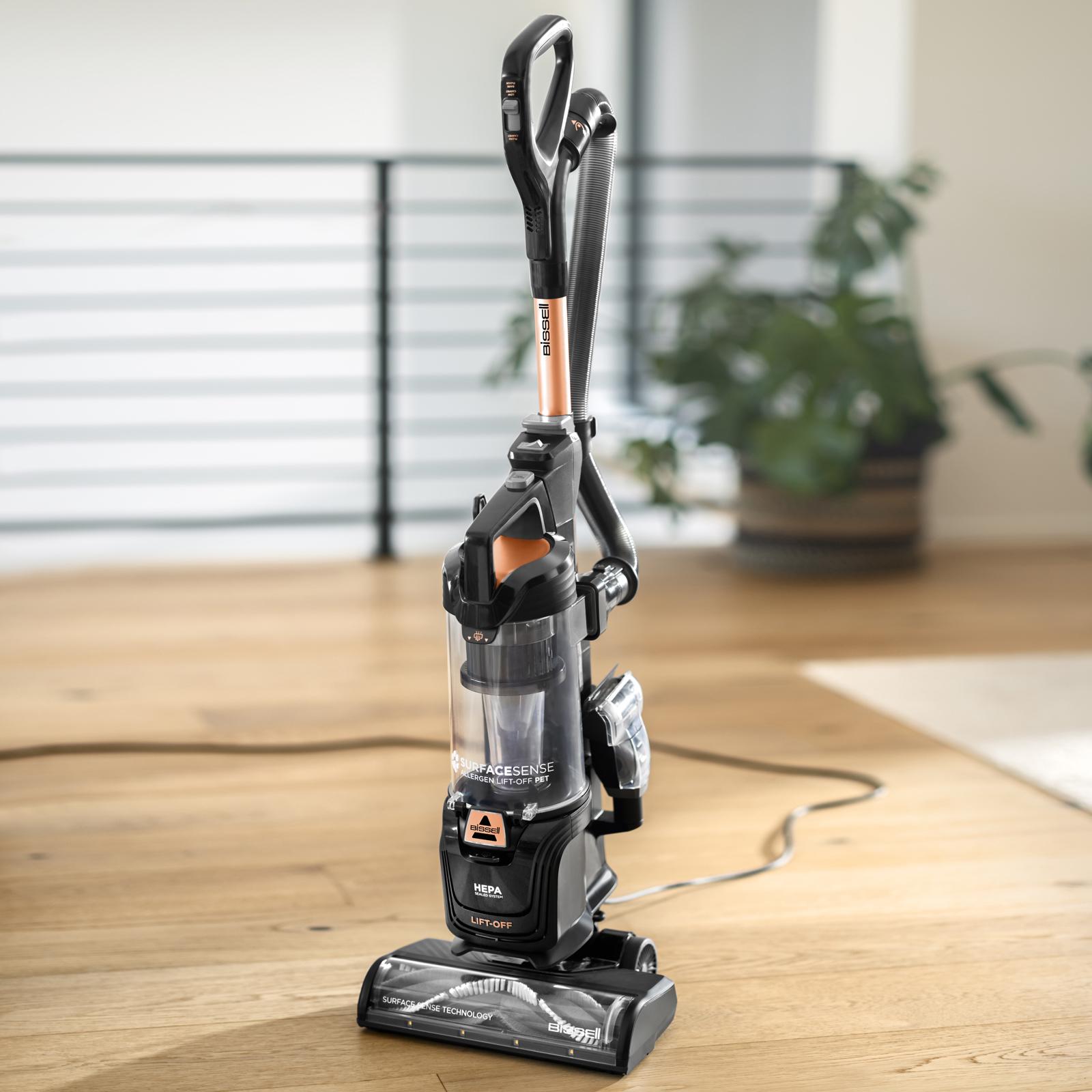 Item Description: BISSELL® SurfaceSense® Allergen Lift-off Pet vacuum uses advanced technology to offer quick, automatic and hands-free transitions for intelligent cleaning performance on any floor type. Plus, the Tangle-Free, Multi-Surface Brush Roll has stiff bristles for cleaning carpet and soft bristles for vacuuming hard floors, so it can pick up everything from fine dust to larger debris. You can now easily switch from a powerful upright vacuum to a detachable, portable canister to conveniently clean hard to reach areas, both on the ground and above.