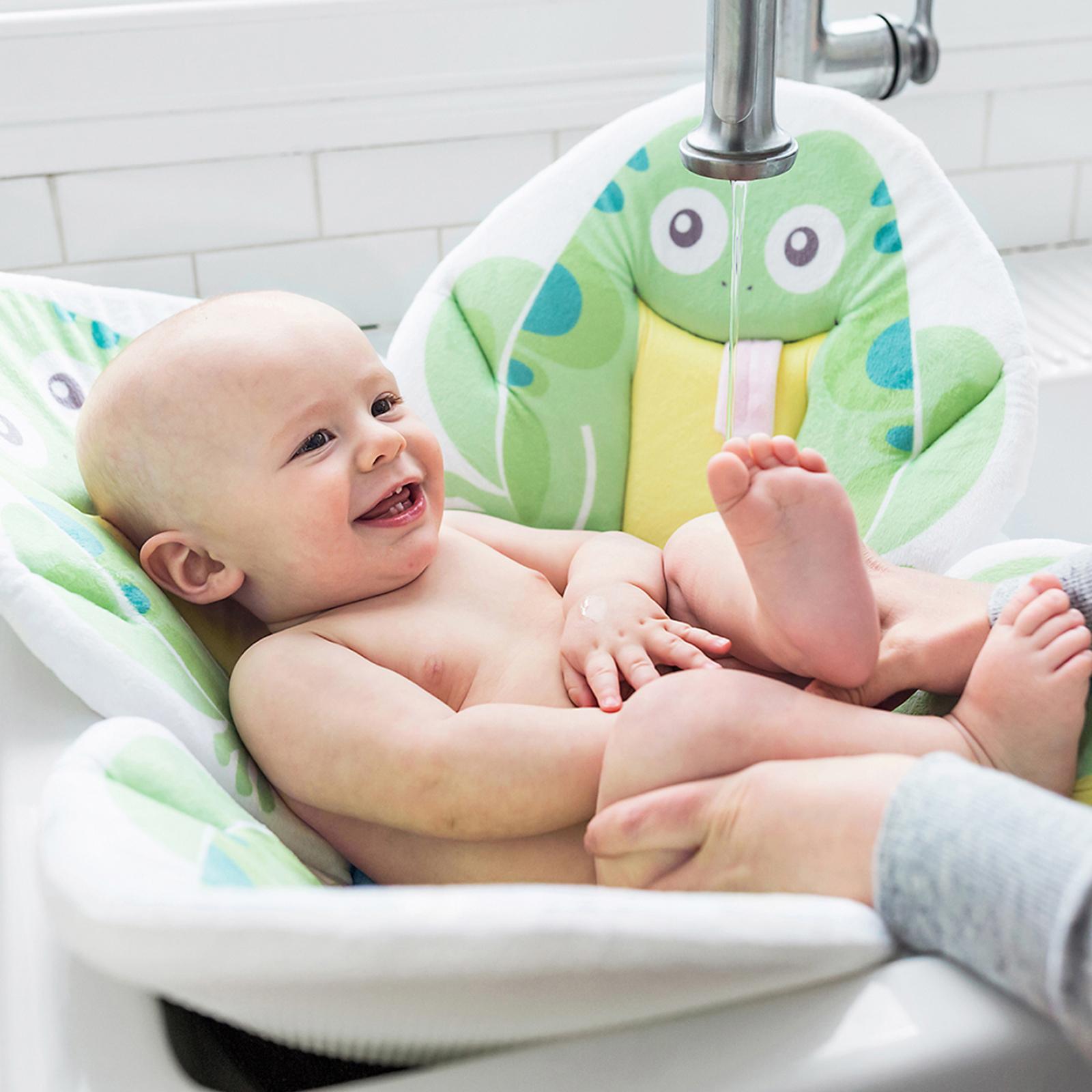 Hop or waddle into this adorable sink bath that creates a happy bonding experience with your precious little one. The Blooming Bath Pond Pal creates a cheerful and practical bath time experience. Simply plug the sink drain, insert the Bath, and pool water to desired level and temperature. Lower baby into bath and admire the smiles. This bath will keep baby entertained with the dimension of the frog tongue or duck bill and super cute, oversized eyes. Once bath time is over, caring for your Pond Pal is a breeze. Once baby is safe and warm, simply wring out the excess water and place in the dryer or hang dry using the loop on the back.