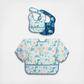 • Sleeved Bib: Adjustable fit with back-tie closure and elasticized cuffs, sized to fit ages 6 to 24 months