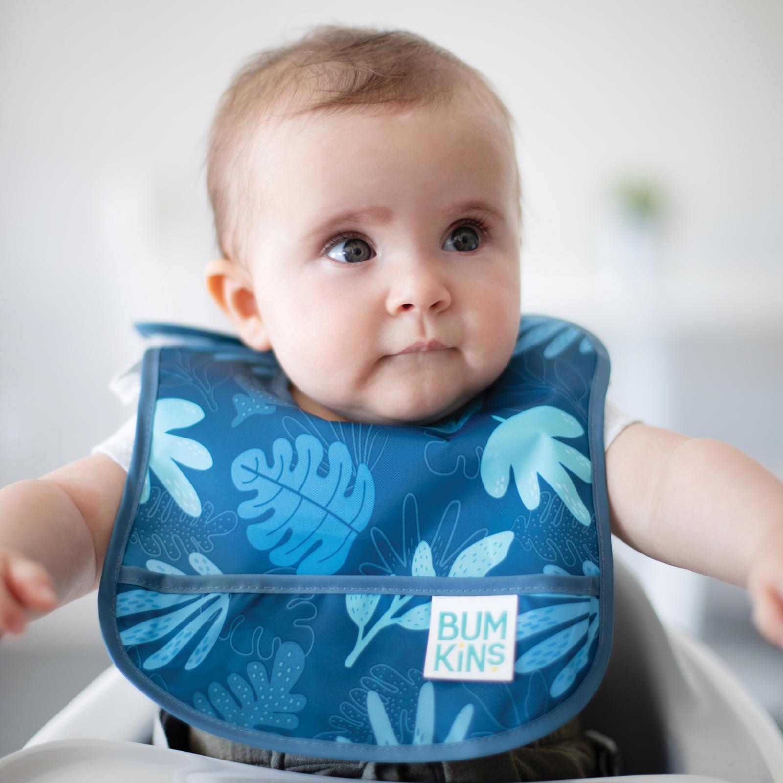 Dive into mealtime with this set of all-star Bibs from Bumkins! Perfect for baby's first foods, this set includes Bumkins Starter Bib 2-Pack & Bumkins Sleeved Bib. Both bibs are made from Bumkins signature lightweight, waterproof, easy-wipe, stain and odor resistant fabric and are wipeable and machine washable so you can them over and over again!