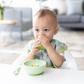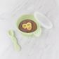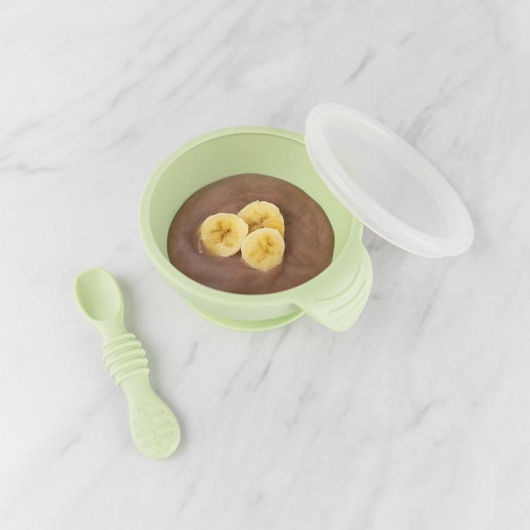 Bumkins Silicone First Feeding Set helps you to introduce solid foods and transition your baby to self-feeding! Great for use on highchair trays or tables where the suction base keeps the bowl from sliding or flipping over. The easy to grip double-end silicone spoon grows with baby - one end is for dipping into purees and the other for scooping solid foods. The bowl is designed with a curved handle so mom or dad can hold and help with feeding. Made with food-safe silicone, the spoon is soft and safe for teething, for ages 4 months and up.