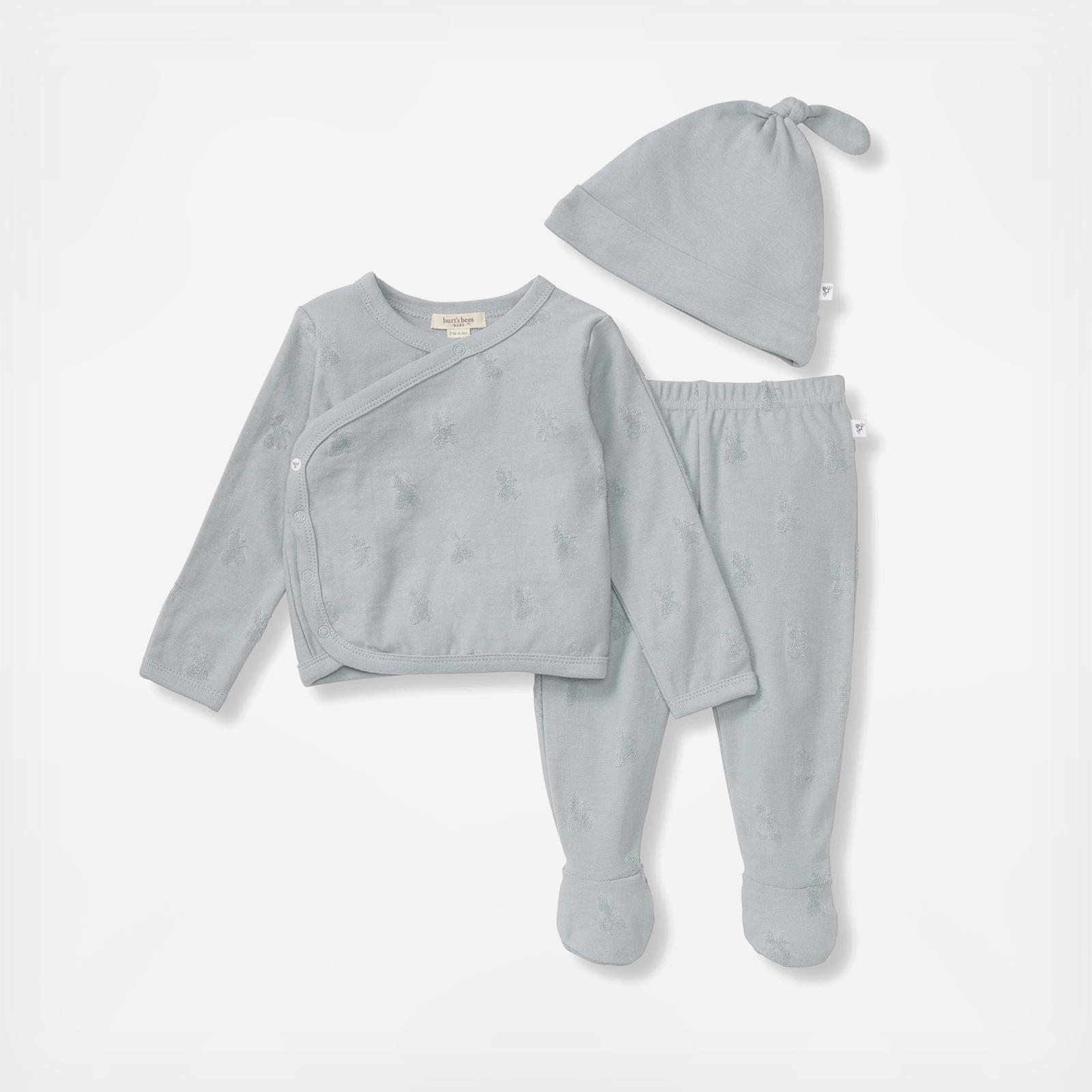 Our 3-Piece Take Me Home Set includes a long sleeve wrap style top paired with a footed pant and matching Top Knot Hat! Welcome your little bee home in the sweetest way.