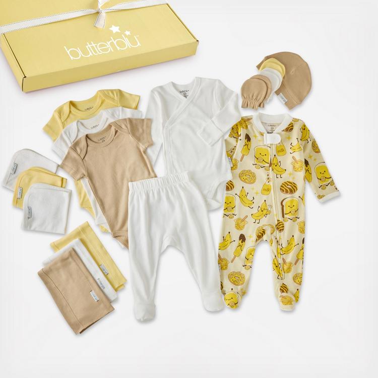 The Sweet beginnings 19-Piece Gift Set was made just for you. Inside you’ll find a side snap bodysuit, 3 short sleeve bodysuits, 1 sleep & play, a pair of footed pants to keep you comfy all day long. There’s a cozy cap to keep your head warm, 6 baby mitts, 3 washcloths and 3 super-absorbent burp cloth for when things get a little messy. Every piece is made from Butteryblu soft organic cotton gentle on your skin and kind to the planet all beautifully tucked inside a recycled gift box with a pretty ribbon.