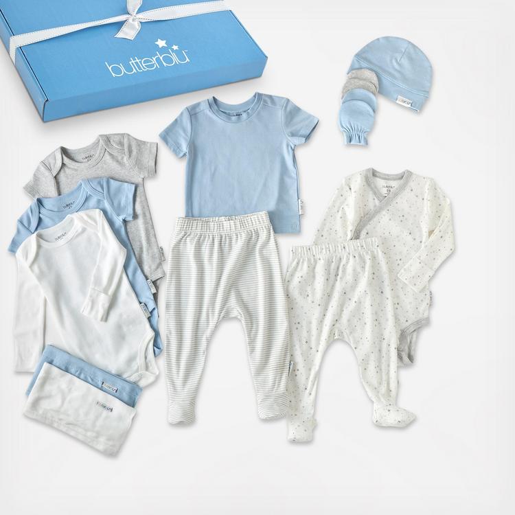 • THOUGHTFUL DESIGN: The Welcome Home 14-piece Gift Set includes: a side snap bodysuit, 2 short sleeve bodysuits, 1 long sleeve bodysuits, a tshirt and 2 footed pants, a cozy cap, 4 baby mitts, and 2 super absorbent burp cloths for head to toes cuteness in soft organic cotton.