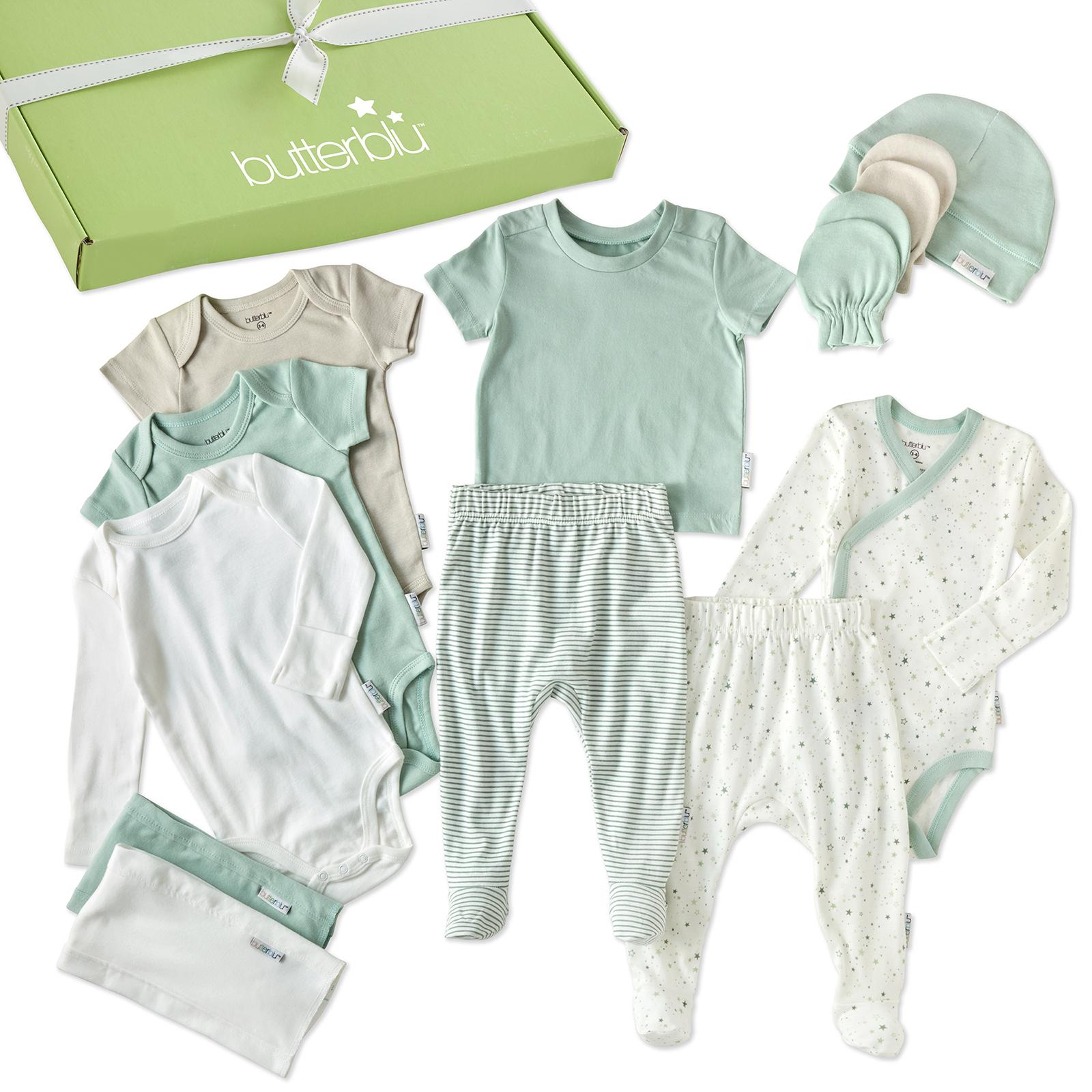 • THOUGHTFUL DESIGN: The Welcome Home 14-piece Gift Set includes: a side snap bodysuit, 2 short sleeve bodysuits, 1 long sleeve bodysuits, a tshirt and 2 footed pants, a cozy cap, 4 baby mitts, and 2 super absorbent burp cloths for head to toes cuteness in soft organic cotton.