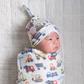 Our top knot hats are designed with baby's comfort in mind. That's why we created them with ultra-soft, breathable fabric with just the right hint of stretch. You can feel confident that baby will feel cozy and comfortable in this darling cap. Our trendy top knot hats are designed in the same prints and patterns seen on our beloved swaddle blankets.They make a perfect pair!