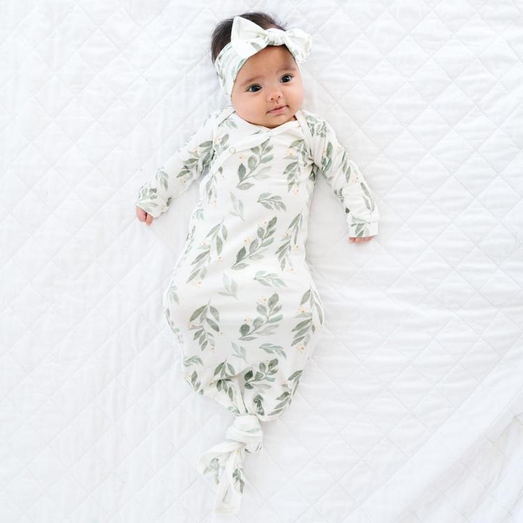 This soft and stretchy gown ties at the bottom for easy diaper changes and has room to grow. Our knotted gowns feature unique snaps to make dressing a breeze, along with fold-over hand mitts to prevent scratching.