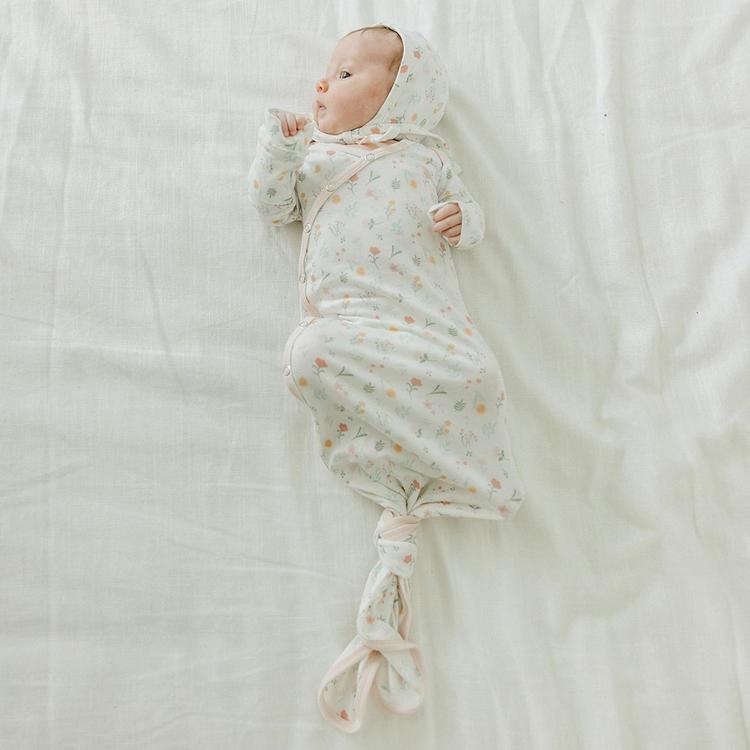 This soft and stretchy gown ties at the bottom for easy diaper changes and has room to grow. Our knotted gowns feature unique snaps to make dressing a breeze, along with fold-over hand mitts to prevent scratching.