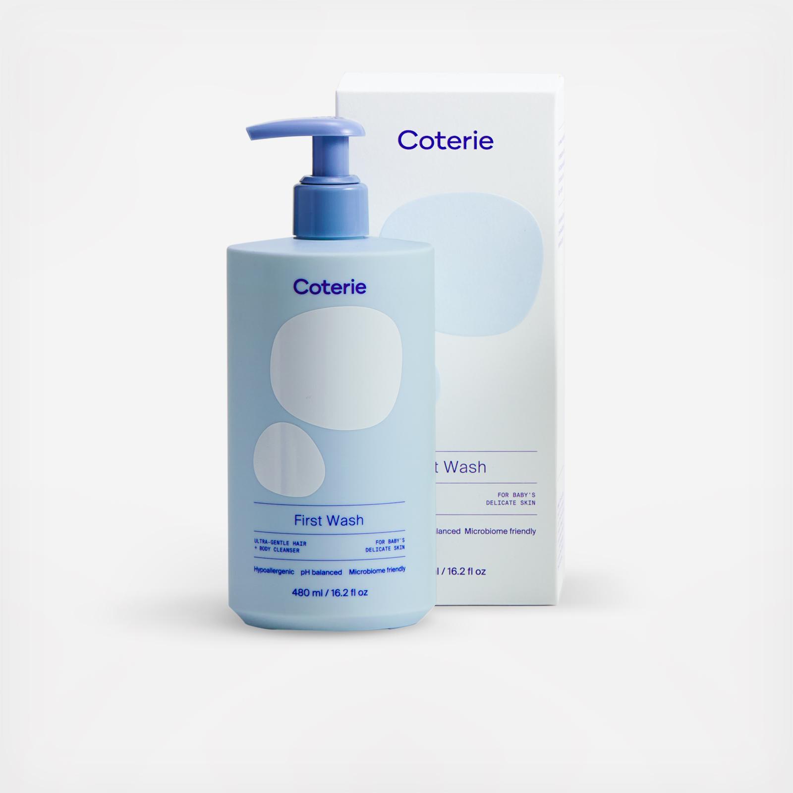 Coterie First Wash is a tear-free hair + body wash, for first baths through toddlerhood. Proven gentle on eyes and sensitive, eczema-prone skin, it cleanses head to toe with a silky lather that leaves skin feeling soft, not stripped. First Wash is also dermatologist tested, hypoallergenic, microbiome friendly, pH balanced, and fragrance free.
