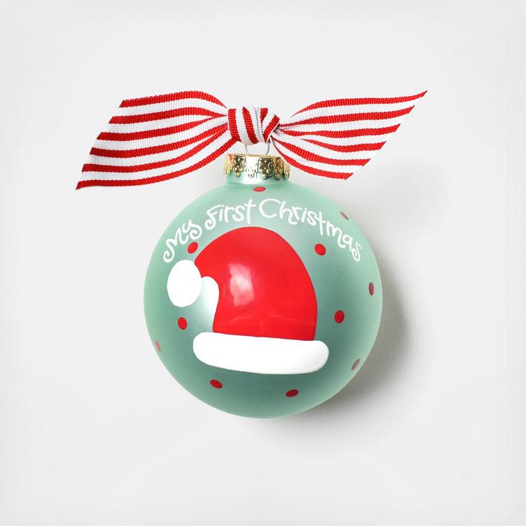 Memorialize the moments that made his first year so special with the My First Christmas Hat glass ornament, featuring a mint base, polka dots and hand-painted Santa hat.