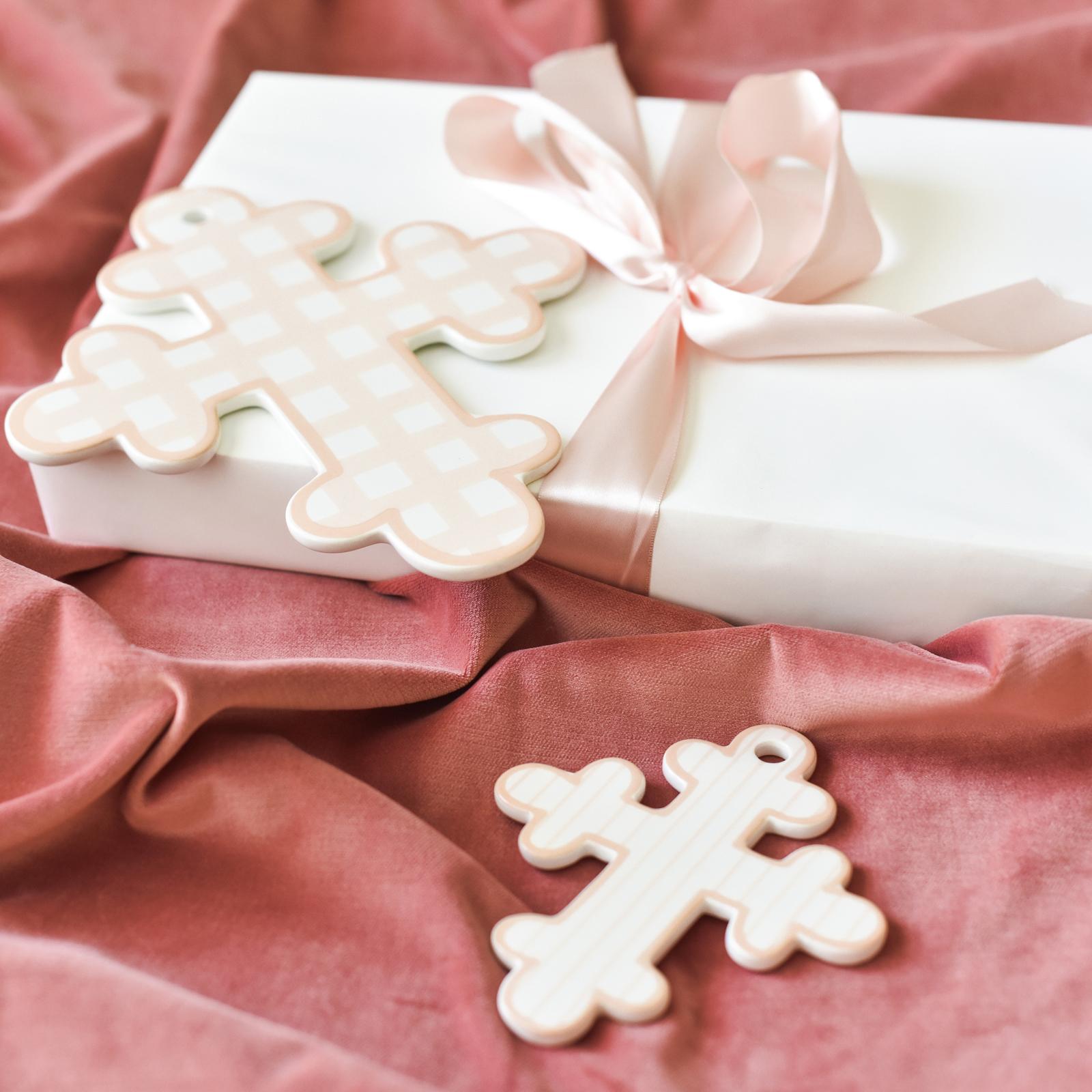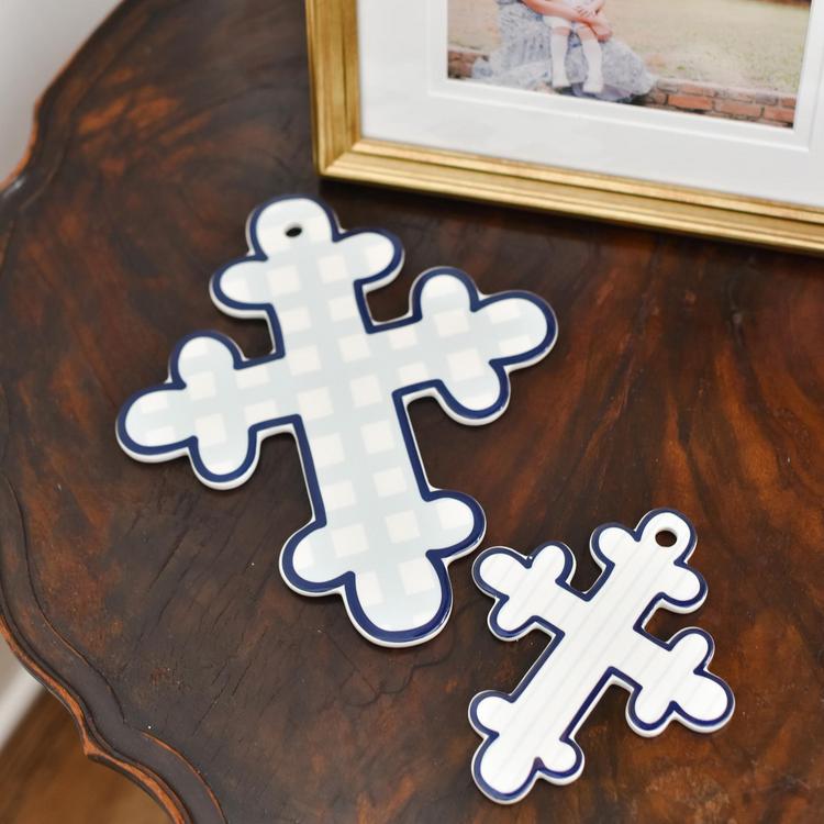 Celebrate a special blessing with Gingham Cross. Featuring the hand-painted gingham pattern in neutral handcrafted ceramic construction and timeless design.