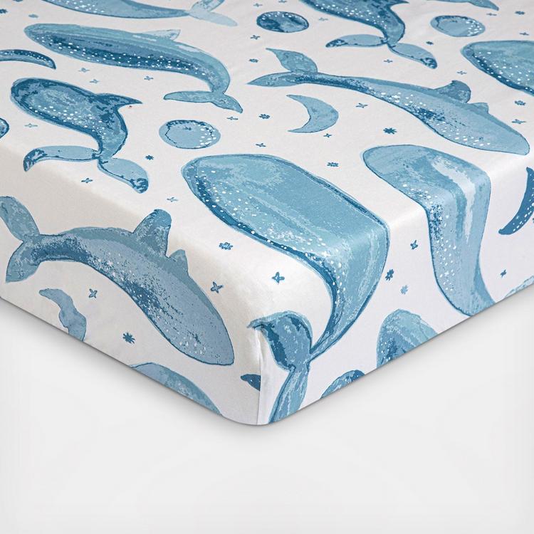 Perfect for an ocean or nautical-themed nursery, this Caspian Whale Crib Fitted Sheet is just what you need for your baby’s crib. The moons, and stars in the crib sheet pattern give a beautiful peaceful feel that will help your baby relax. In addition, cotton and other material sheets soften with every wash and will carry your baby away into peaceful dreams.