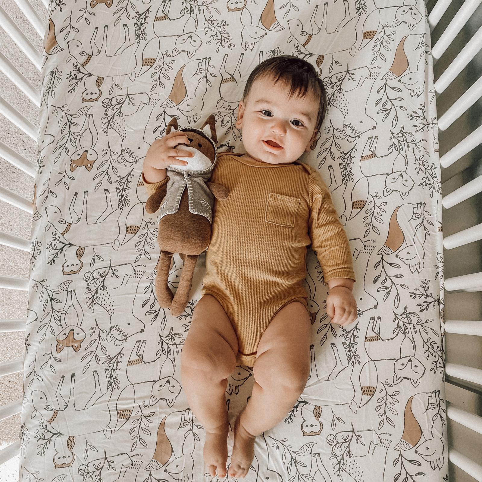 Foxes, and deer, and owls, and bears oh my. Dress your baby’s crib in a comfortable cotton sateen fitted crib sheet. This Ezra Crib Fitted Sheet features watercolor whimsical woodland animals to compliment your nursery style. Baby will be carried off to sleep in their cozy crib sheets that are breathable and soften with every wash. So, baby’s crib will be their new favorite place.