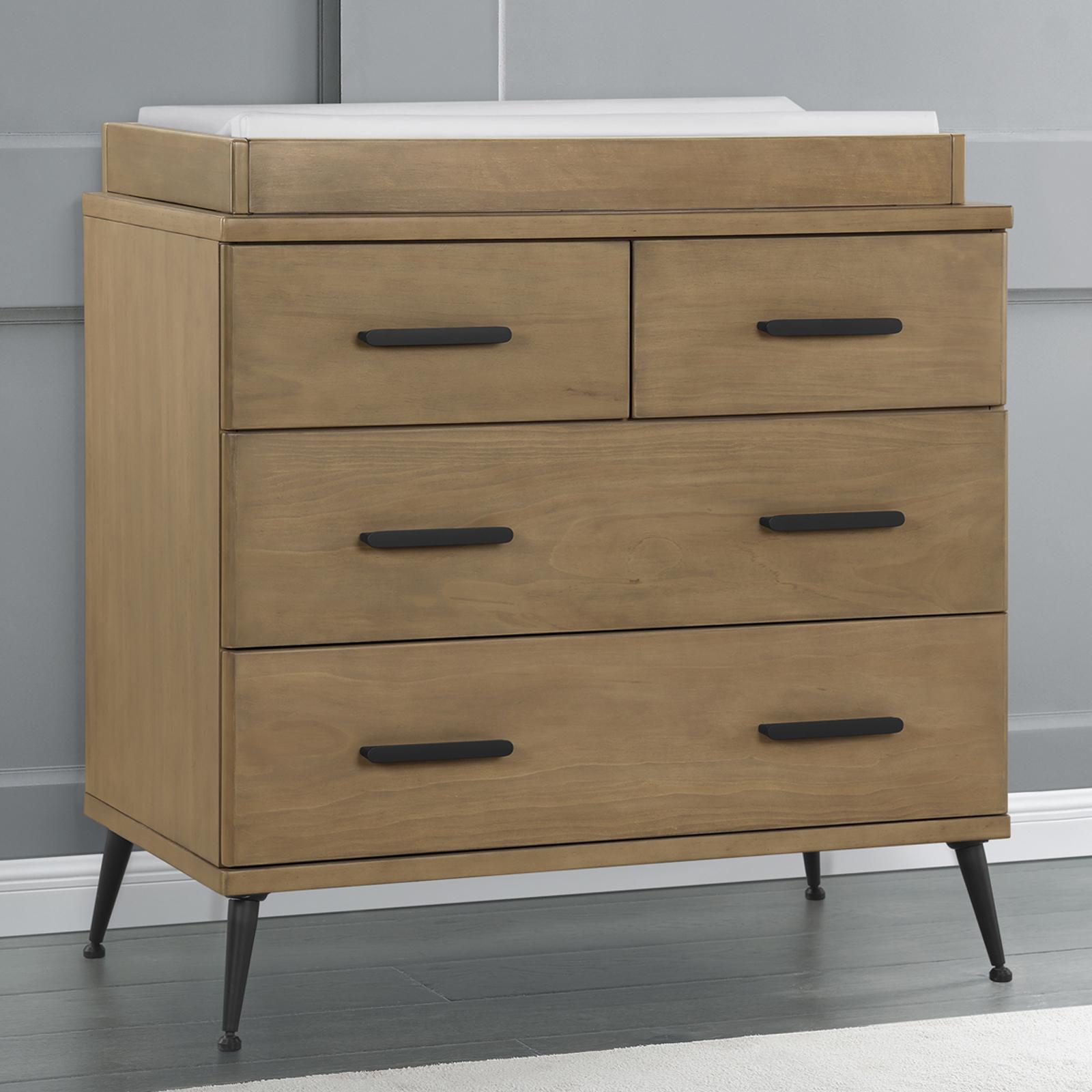 The Sloane 4 Drawer Dresser with Changing Top and Interlocking Drawers by Delta Children is the ultimate piece of kids’ furniture. Sleek and modern, it boasts a mixed material design with bronze splayed feet and drawer handles that make it elevated enough for your master bedroom. But this dresser is more than just fashionable—it's super functional, too. It features four spacious drawers for ample clothing storage and includes a removable changing top that creates the perfect space for diaper changing. Remove the changing top to create a more grown-up space later on. For your child’s safety, this dresser is outfitted with an interlocking drawer system that limits the number of drawers that can be opened at one time. Plus, it’s GREENGUARD Gold Certified, which means it’s built to contribute to cleaner air for a healthy home. Pair this dresser with other pieces in the Delta Children Sloane Collection for a coordinated look. This Delta Children dresser is tested to meet the current requirements of ASTM F2057, the mandatory CPSC safety standard that protects young children from furniture tip-over incidents. For your children’s safety, only purchase dressers that comply with this standard. For additional security, Delta Children strongly recommends that all dressers in your home be anchored; all Delta dressers include a wall anchor. To learn how to properly secure your dresser, please see the product assembly instructions or visit our website.