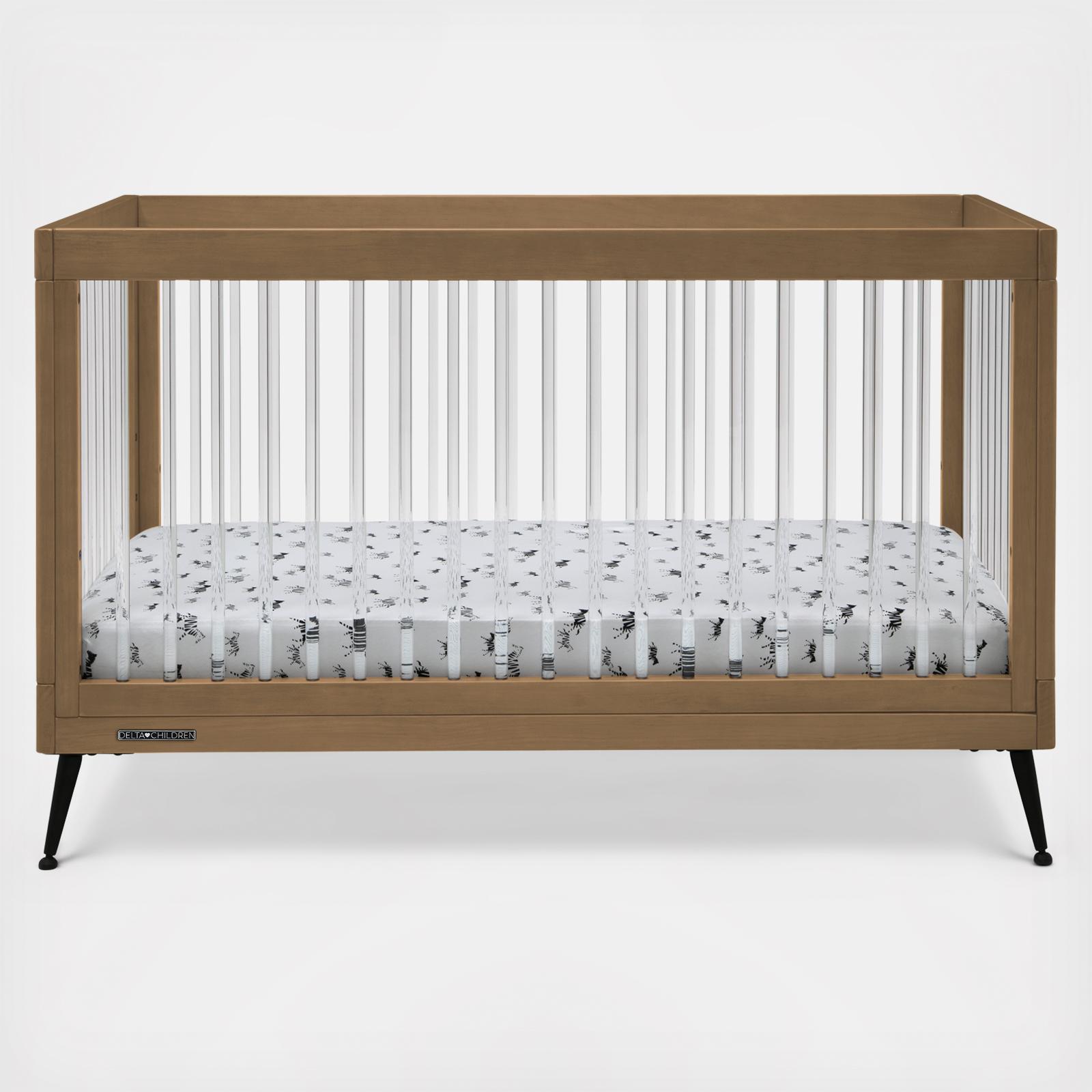 The Sloane 4-in-1 Acrylic Convertible Crib by Delta Children is the clear choice for your baby’s modern nursery! Its unique design features clear acrylic spindles that provide an open, airy feel while the splayed feet add some polish to the clean lines. And if that's not enough, it even converts from crib to a toddler bed, sofa and daybed, making this a versatile bed that grows with your child (conversion rail included). To complete your nursery, pair with the coordinating Sloane 4 Drawer Dresser. The Acorn finish is crafted with a special hand-applied glaze for added depth and dimension.