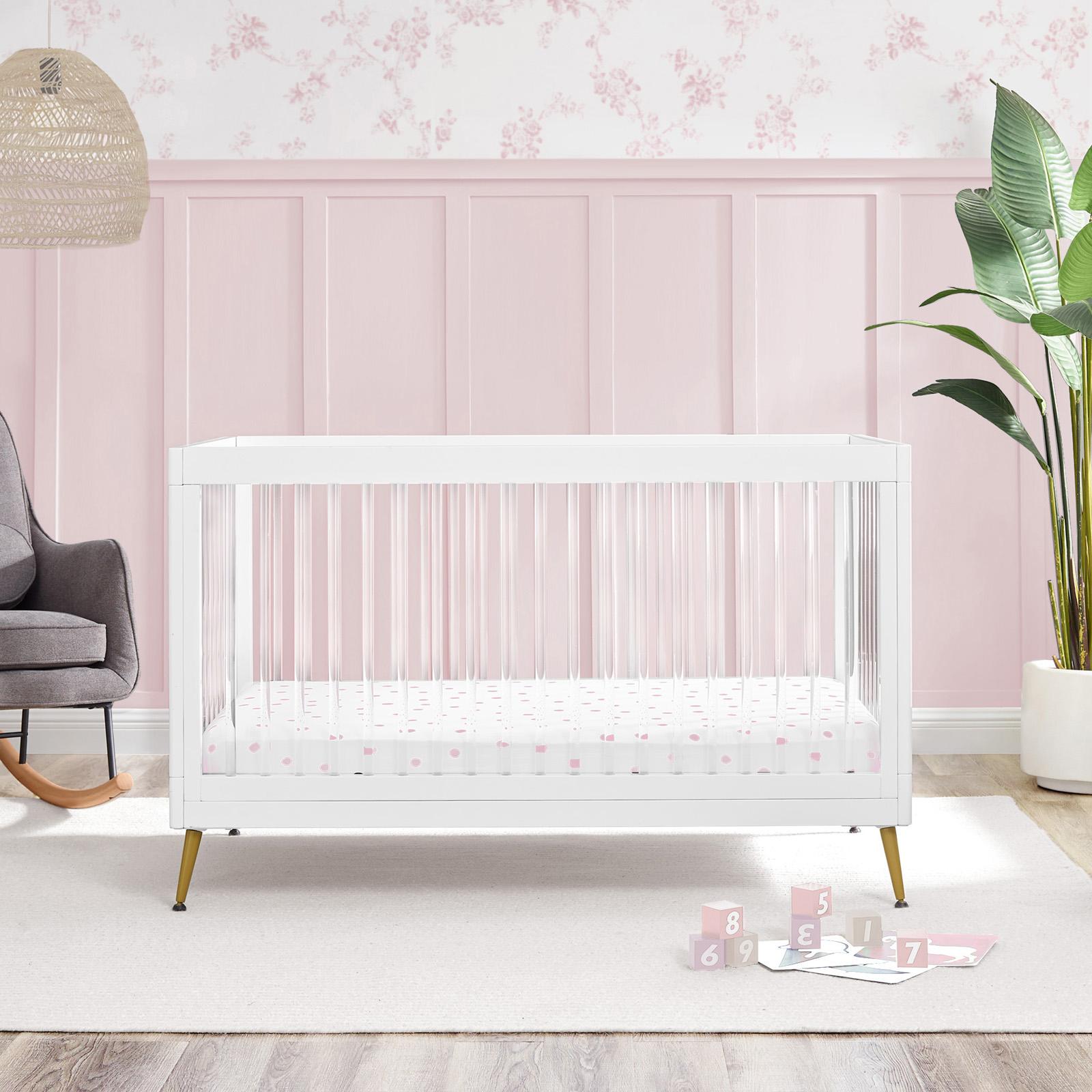 The Sloane 4-in-1 Acrylic Convertible Crib by Delta Children is the clear choice for your baby’s modern nursery! Its unique design features clear acrylic spindles that provide an open, airy feel while the splayed feet add some polish to the clean lines. And if that's not enough, it even converts from crib to a toddler bed, sofa and daybed, making this a versatile bed that grows with your child (conversion rail included). To complete your nursery, pair with the coordinating Sloane 4 Drawer Dresser. The Acorn finish is crafted with a special hand-applied glaze for added depth and dimension.