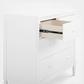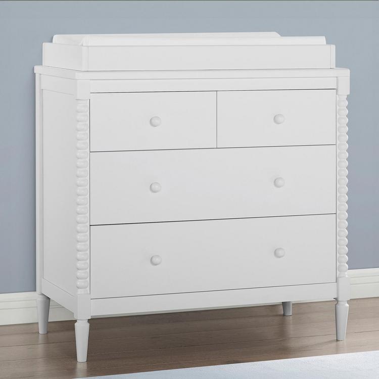 A modern take on vintage-inspired Jenny Lind furniture, the Saint 4-Drawer Dresser with Changing Top and Interlocking Drawers by Delta Children is adorned with solid wood turned posts. A timeless option for your baby’s nursery, it can be styled traditionally, modernly or eclectically, to effortlessly create a look all your own. Designed to grow with your little one, the included changing topper can be easily removed once your child no longer needs a changing table. For your child’s safety, this dresser is outfitted with an interlocking drawer system that limits the number of drawers that can be opened at one time. To complete your nursery, pair the Saint 4-Drawer Dresser with Changing Top with the Saint 4-in-1 Convertible Baby Crib by Delta Children. Changing Pad not included.