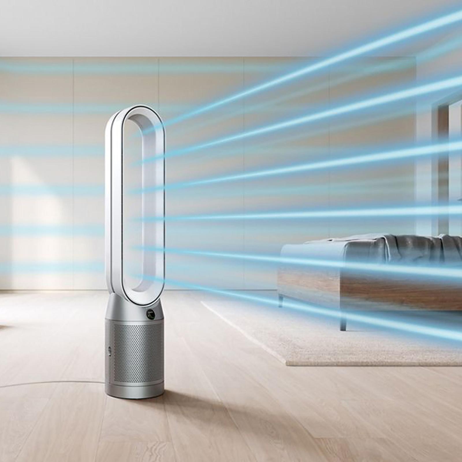 Purify and cool a full room with the TP07 purifying fan. Air Multiplier technology. MyDyson app alerts for a new filter and allows easy control. Automatically senses and reacts to changes in air quality to intelligently purify. HEPA 13 filter captures 99.97% of particles as small as 0.3 microns. Traps common household pollutants. Up to 350-degree oscillation. Backward airflow mode purifies without cooling. 10 Fan and Cool settings. 6ft Power cord. Includes 2 HEPA H13 filters.