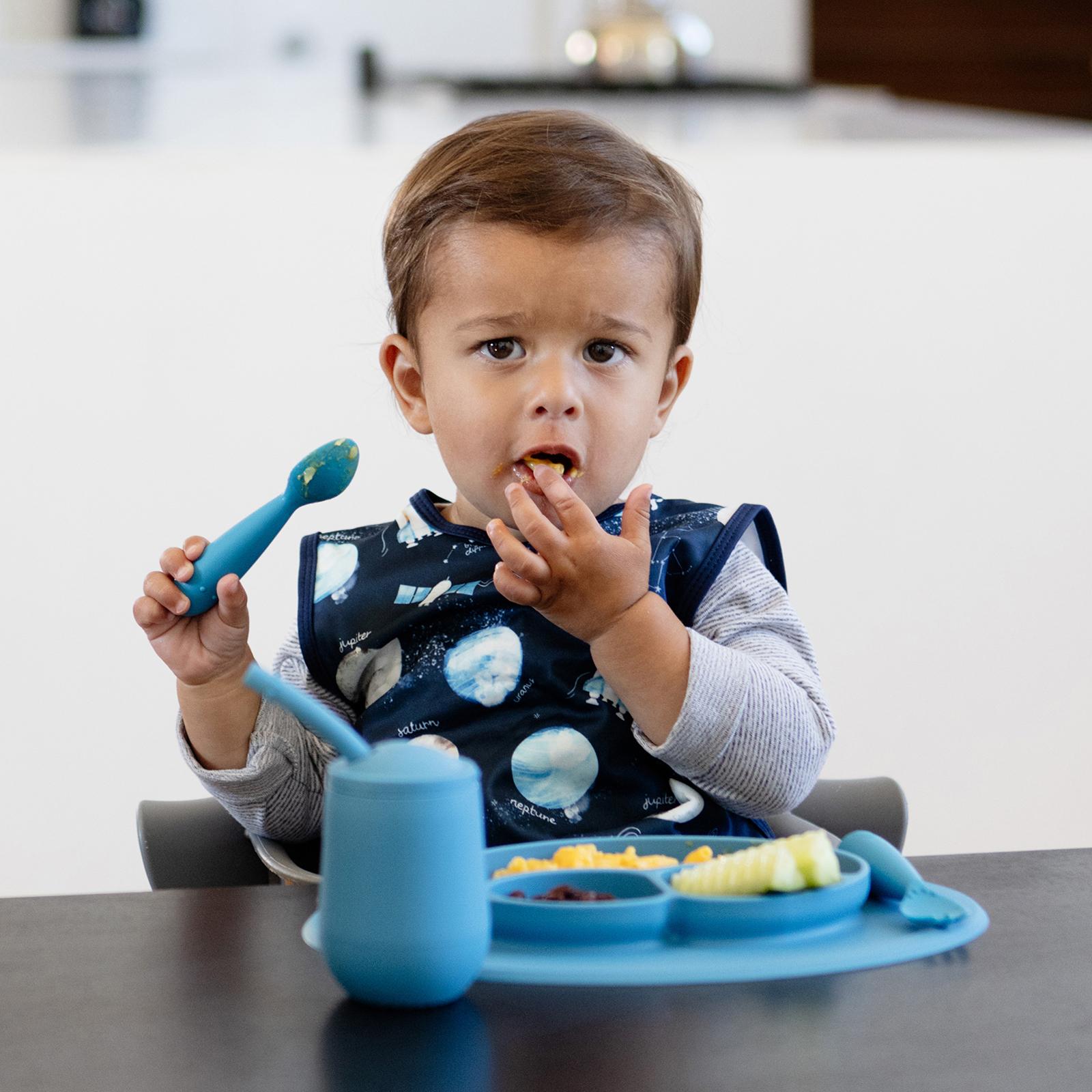 As your infant transitions to toddlerhood, they are ready to start practicing new mealtime milestones. They are eating a balanced meal with different food groups and are learning how to eat with a spoon (scooping) and fork (piercing). The Mini Feeding Set provides all of the developmental tools you need for independent mealtime with your toddler and helps your toddler meet meal time milestones. Built to last (silicone will not wear, fade or corrode).