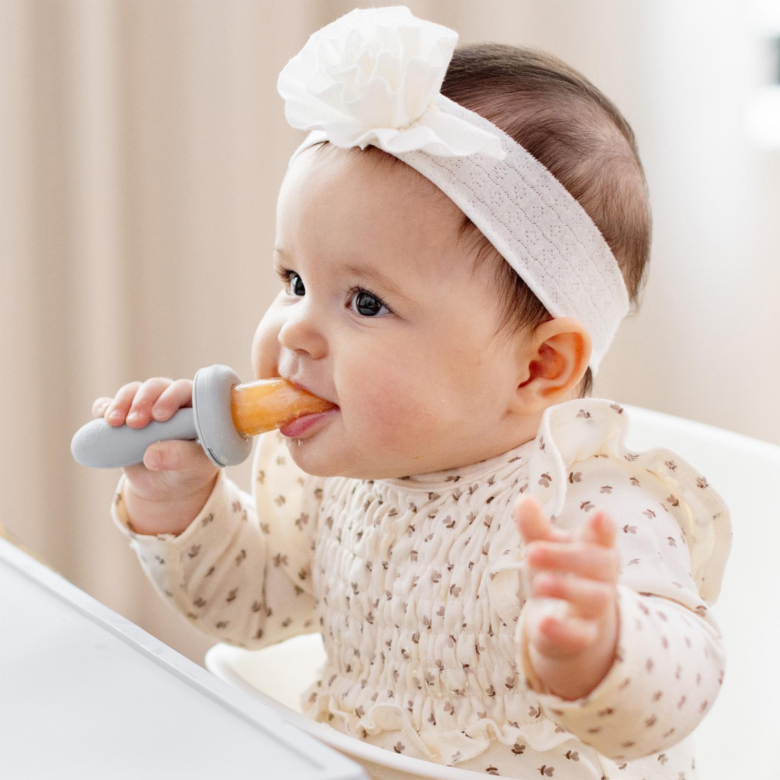 The BLW Readiness Bundle includes the Gumline Feeder and Ice Tray. With these two tools babies can practice their feeding, munching, and chewing skills safely. Simply fill the Ice Tray with breast milk, formula, purees, or leftover food, and freeze for 2+ hours. Easily slide the strip into the silicone pouch.