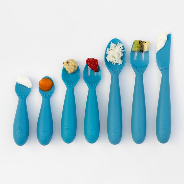 The Developmental Utensil Set provides babies, toddlers and preschoolers with the training tools they need to safely use utensils and self-feed. The developmental system starts with the Tiny Spoons for dipping (4 months +), followed by the Mini Utensils for scooping + piercing (12 months +) and concludes with the Happy Utensils, which layers in knife skills like spreading and cutting (2 years +).