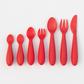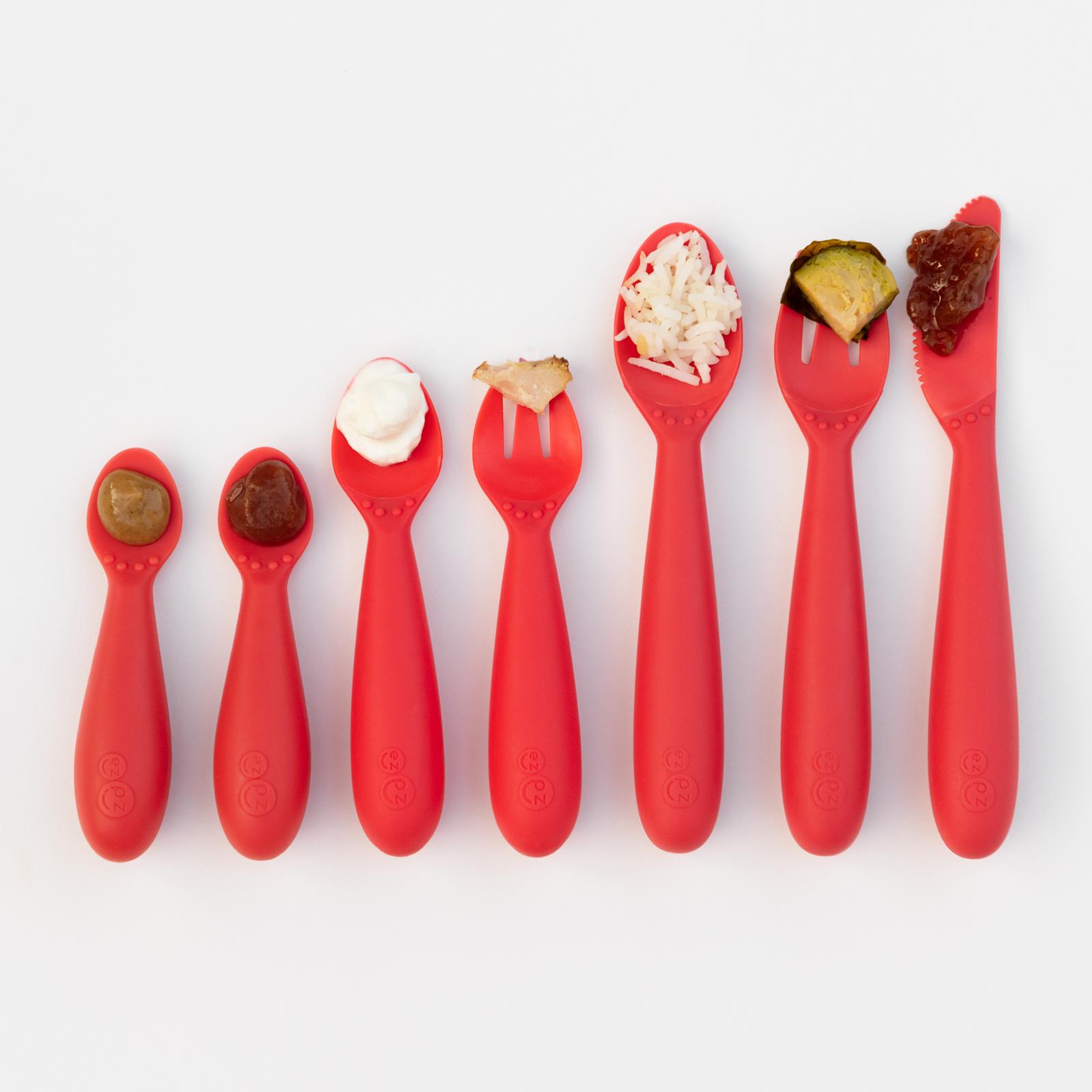 The Developmental Utensil Set provides babies, toddlers and preschoolers with the training tools they need to safely use utensils and self-feed. The developmental system starts with the Tiny Spoons for dipping (4 months +), followed by the Mini Utensils for scooping + piercing (12 months +) and concludes with the Happy Utensils, which layers in knife skills like spreading and cutting (2 years +).