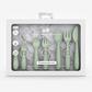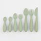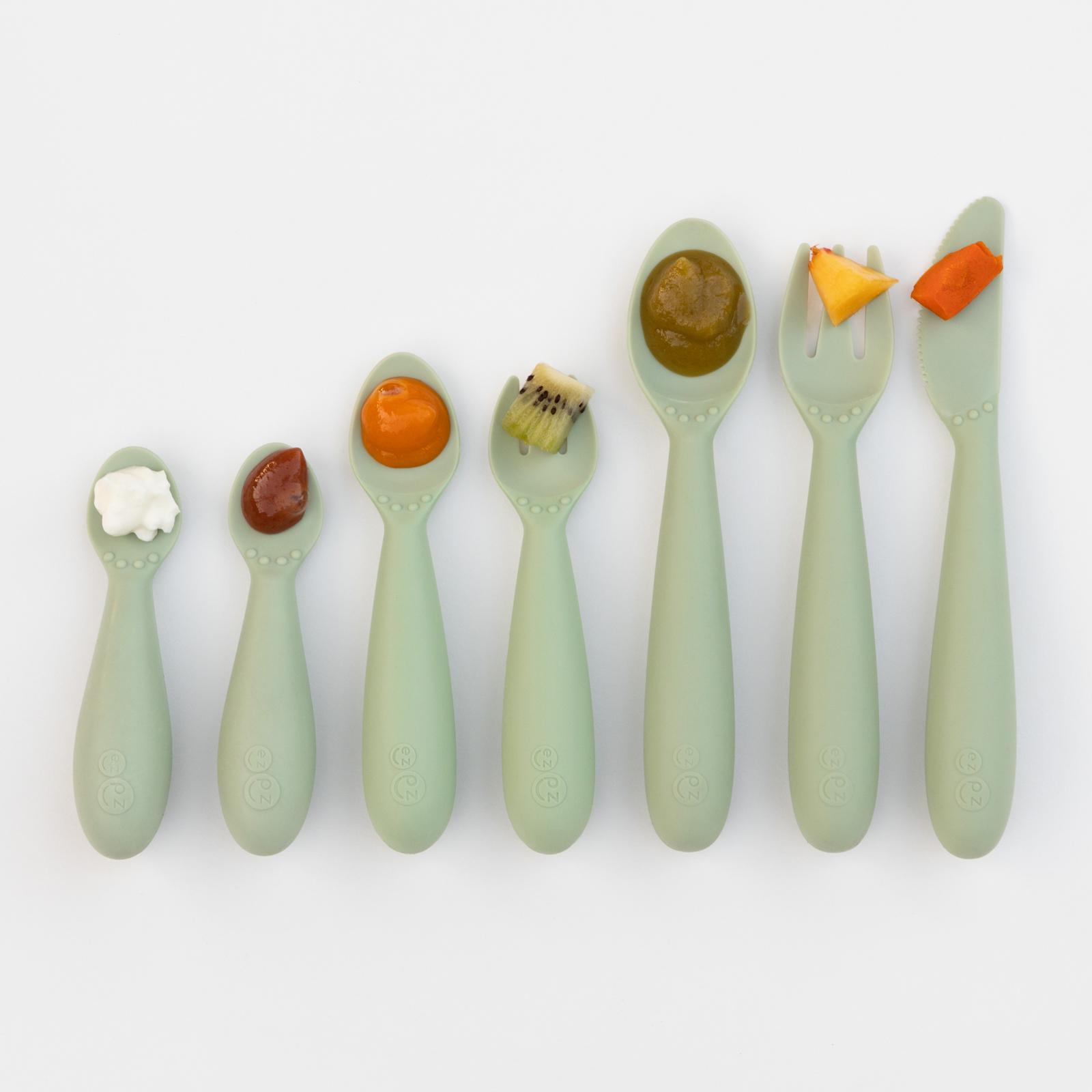 The Developmental Utensil Set provides babies, toddlers and preschoolers with the training tools they need to safely use utensils and self-feed. The developmental system starts with the Tiny Spoons for dipping (4 months +), followed by the Mini Utensils for scooping + piercing (12 months +) and concludes with the Happy Utensils, which layers in knife skills like spreading and cutting (2 years +).