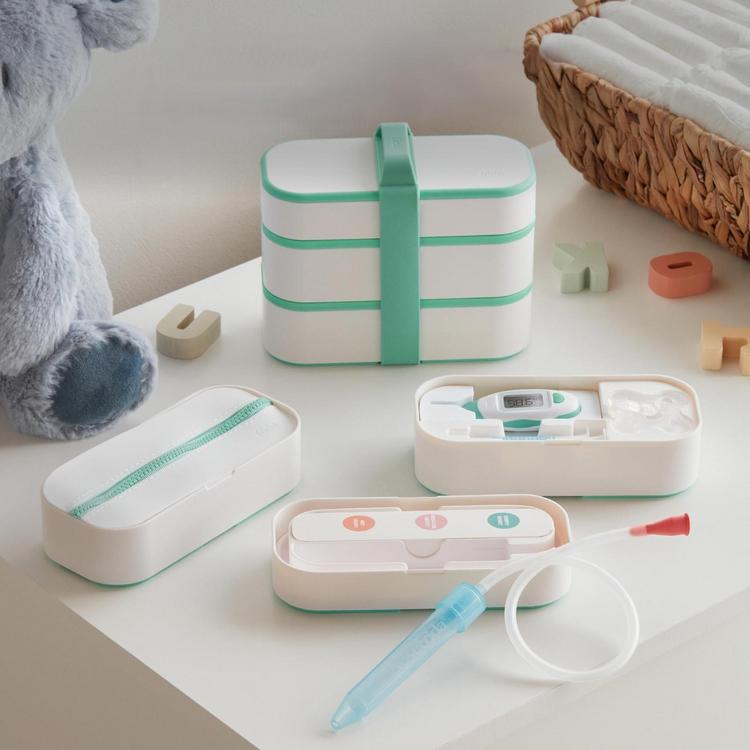 We bento-ver backwards to create a Frida storage system that plays nicely in your drawers and in the diaper bag. Meet the Mobile Medicine Cabinet. Separate its layers in your nursery drawers to keep fuss-busting essentials easily accessible. When you're ready to take baby out on the town, pack it, stack it and strap it to keep everything together while on-the-go. We loaded it up with NoseFrida + Filters, MediFrida, Rectal Thermometer + a removable pouch so you're prepped for baby's snotty, under-the-weather moments no matter where they happen. Plus, the removable silicone pouch is perfect for storing baby meds or must-haves.