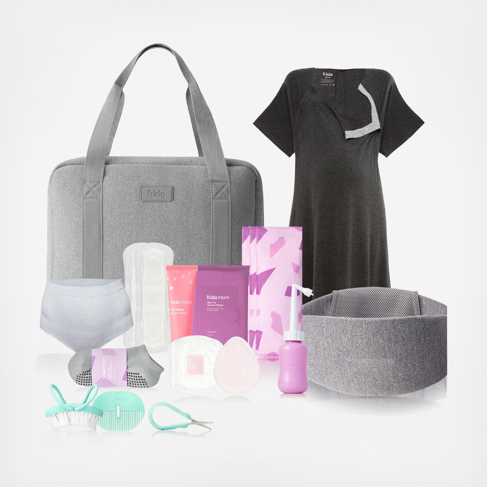 Send stress packing with this complete c-section delivery, postpartum recovery and beyond-baby essentials bag. Everything mom will actually need for the hospital, thoughtfully curated and pre-packed, so she can skip the last-minute packing dash. Recovery Band, Labor and Delivery Gown, Socks, 5-Step Postpartum Recovery Regimen, Nipple Balm, Hydrogel Nipple Pads, Nursing Pads, Scar Patches, and Frida Baby newborn grooming must-haves - Nail Scissors, Hairbush + Comb, and Body Mitts. The ideal shower gift to give and receive.