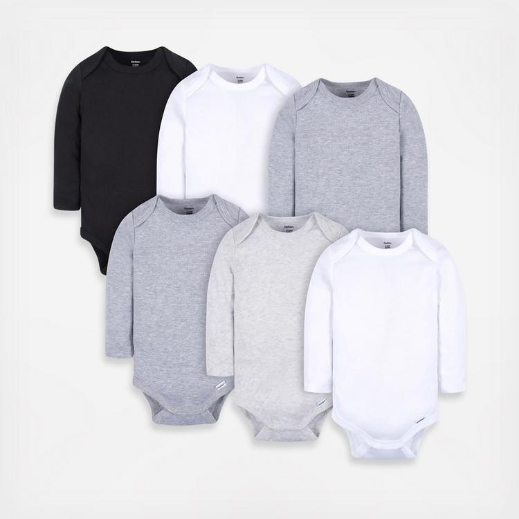 Gender-neutral long sleeve Onesies® Bodysuits are the perfect way to keep the little warm on chilly days. Designed in base colors, its easy to create matching layers when the weather turns colder. Made from 100% cotton and ideal for sensitive skin, they are perfect for any time. Comfort-stretch ribbing around the neck and legs makes sure little one stays comfy all day long. And getting dressed is easy with a pullup or pullover style and secure leg snaps. When its time for a diaper change, simply undo the snaps, or use the shoulder flaps to remove the entire outfit if necessary. Our essentials have been independently certified with STANDARD 100 by OEKO-TEX so that theres no worry about harmful substances in babys wardrobe. This pack includes six Onesies Bodysuits.