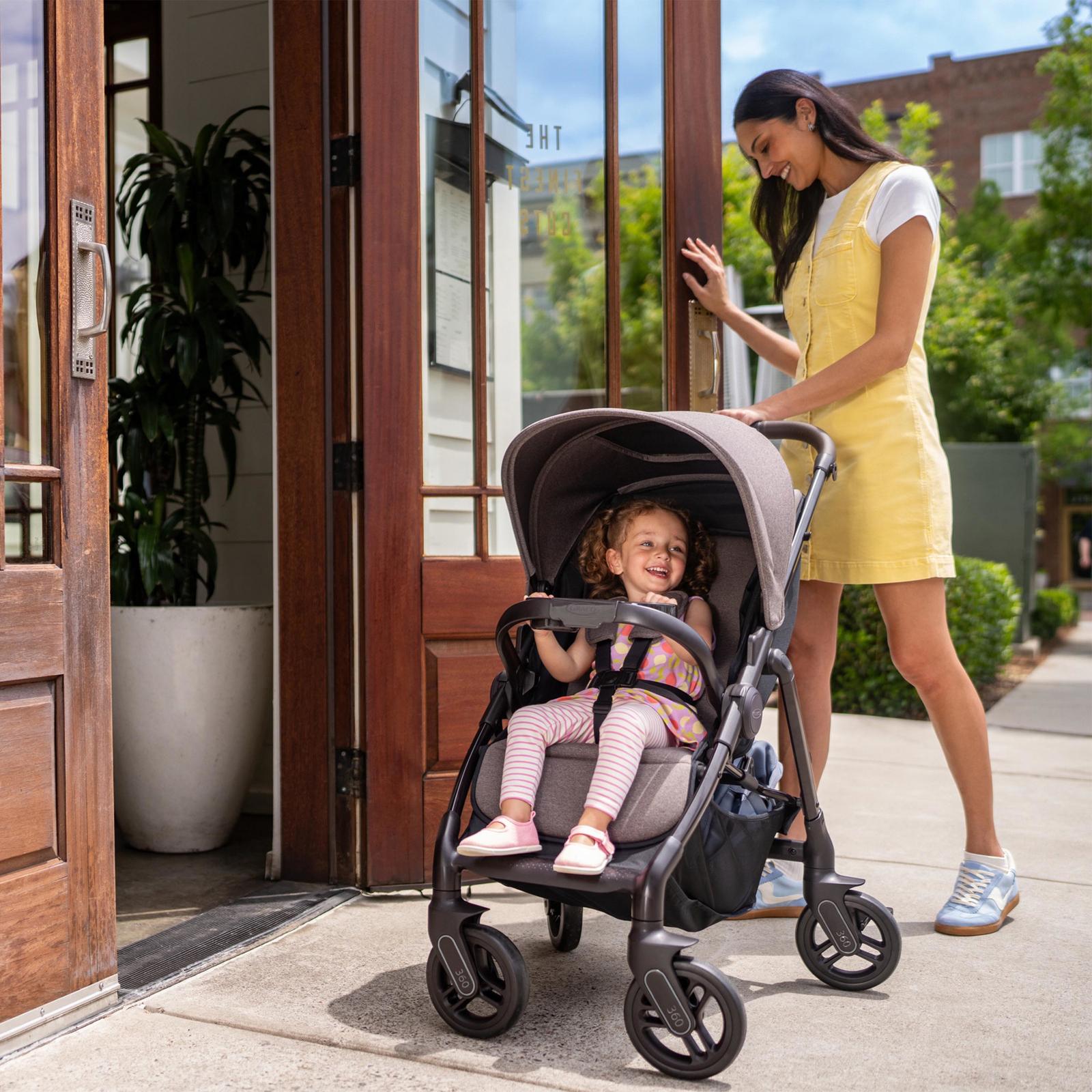 The Graco® Merge Stroller is thoughtfully designed to move with you, so you feel confident, connected, and in control every step of the way. With the push of a button, all 4 wheels rotate 360° to glide smoothly in any direction, making tight corners, crowded spaces, and tricky turns feel completely seamless. The smooth experience continues with the Graco signature FastAction™ fold, which provides a one-second, one-hand fold for parents on-the-go. Its durable steel frame, plush seat fabrics, and a high-quality knit canopy are made to go the distance from your first stroll together through your everyday routines. A convertible 3- or 5-point no-rethread harness, one-hand reclining seat, and removable child's tray help keep your little one safe and comfortable. Plus, thoughtful touches like a leatherette handle, parent cup holder, and ample storage make every outing feel effortless.