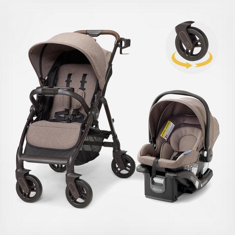 The Graco® Merge Travel System is thoughtfully designed to move with you, so you feel confident, connected, and in control every step of the way. With the push of a button, all 4 wheels rotate 360° to glide smoothly in any direction, making tight corners, crowded spaces, and tricky turns feel completely seamless. The smooth experience continues with the Graco signature FastAction™ fold, which provides a one-second, one-hand fold for parents on-the-go. Its durable steel frame, plush seat fabrics, and a high-quality knit canopy are made to go the distance from your first stroll together through your everyday routines. A convertible 3- or 5-point no-rethread harness, one-hand reclining seat, and removable child's tray help keep your little one safe and comfortable. Plus, thoughtful touches like a leatherette handle, parent cup holder, and ample storage make every outing feel effortless. This stroller car seat combo includes the Graco SnugRide® Lite DLX Infant Car Seat, rear-facing for infants from 4-30 lb and up to 32".